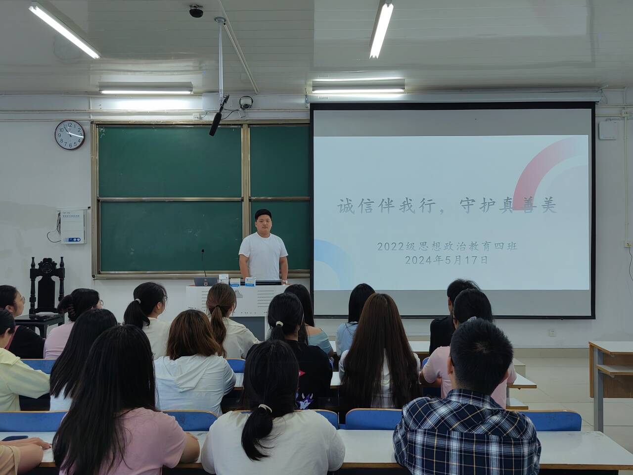 为进一步加强学生道德修养,增强学生诚信意识,在校园形成讲诚信、树诚信、践诚信的良好风气,5月17日上午,beat365亚洲版官网2022级思想政治教育四班在社科楼514教室组织召开“诚信伴我行,守护真善美”主题班会。beat365官网2022级思想政治教育四班全体成员参与本次班会。本次团课由副班长宋奕铭主持。