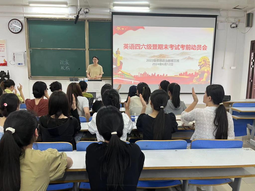 为进一步缓解同学们的学习压力,激发拼搏动力,6月12日上午,beat365亚洲版官网2022级思想政治教育三班在社科楼514教室召开英语四六级暨期末考试考前动员会。beat365官网2022级思想政治教育三班班主任吴梦云和三班全体成员共同参与此次班会,班会由班主任吴梦云主持。
