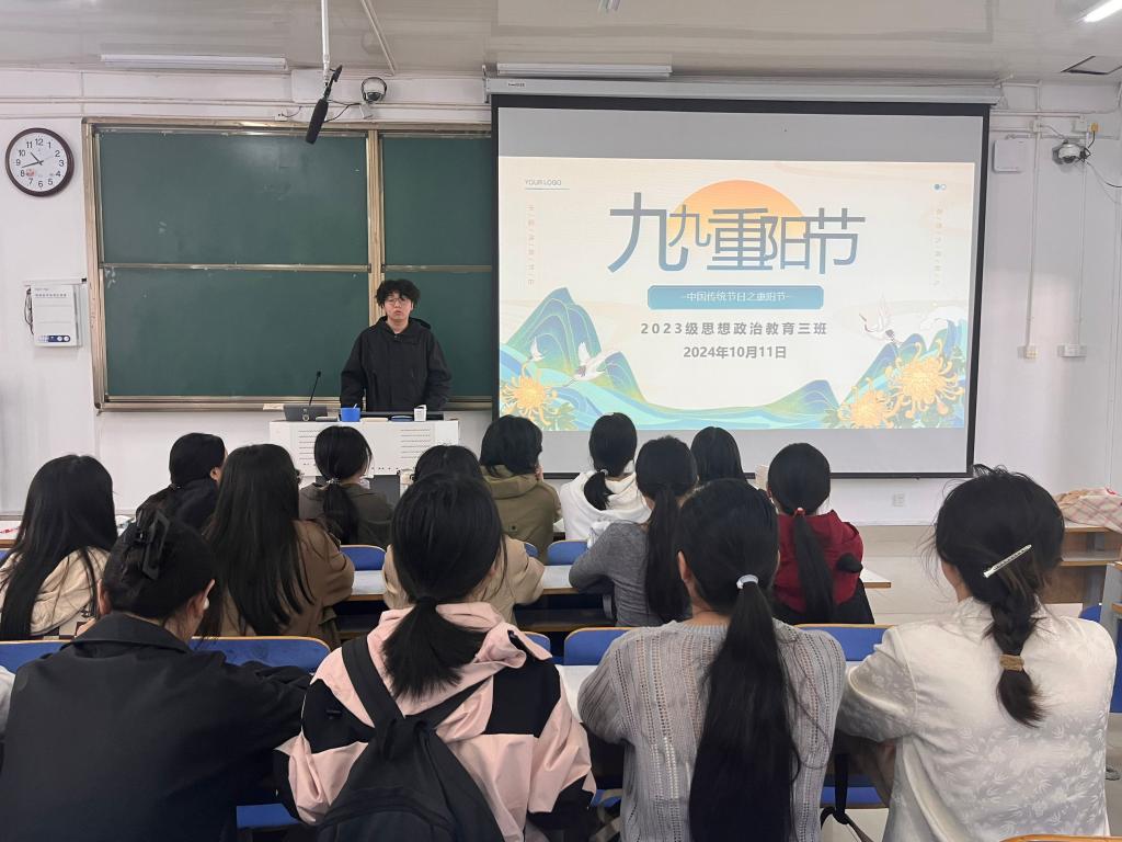 10月11日上午,beat365亚洲版官网2023级思想政治教育三班在社科楼515召开“九九重阳节”主题班会。beat365官网2023级思想政治教育三班全体同学共同参与本次班会,班会由团支书郝瀚主持。