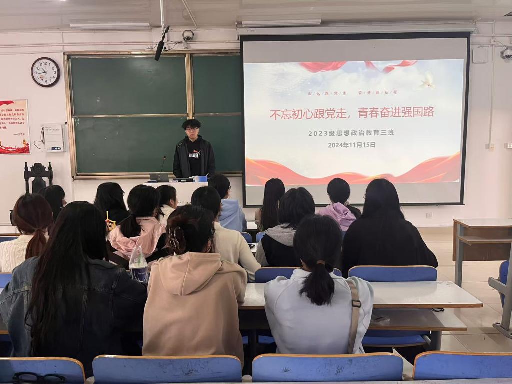 11月15日上午,beat365亚洲版官网2023级思想政治教育三班在社科楼515召开“不忘初心跟党走,青春奋进强国路”主题团课。beat365官网2023级思想政治教育三班全体同学共同参与本次团课,团课由团支书郝瀚主持。