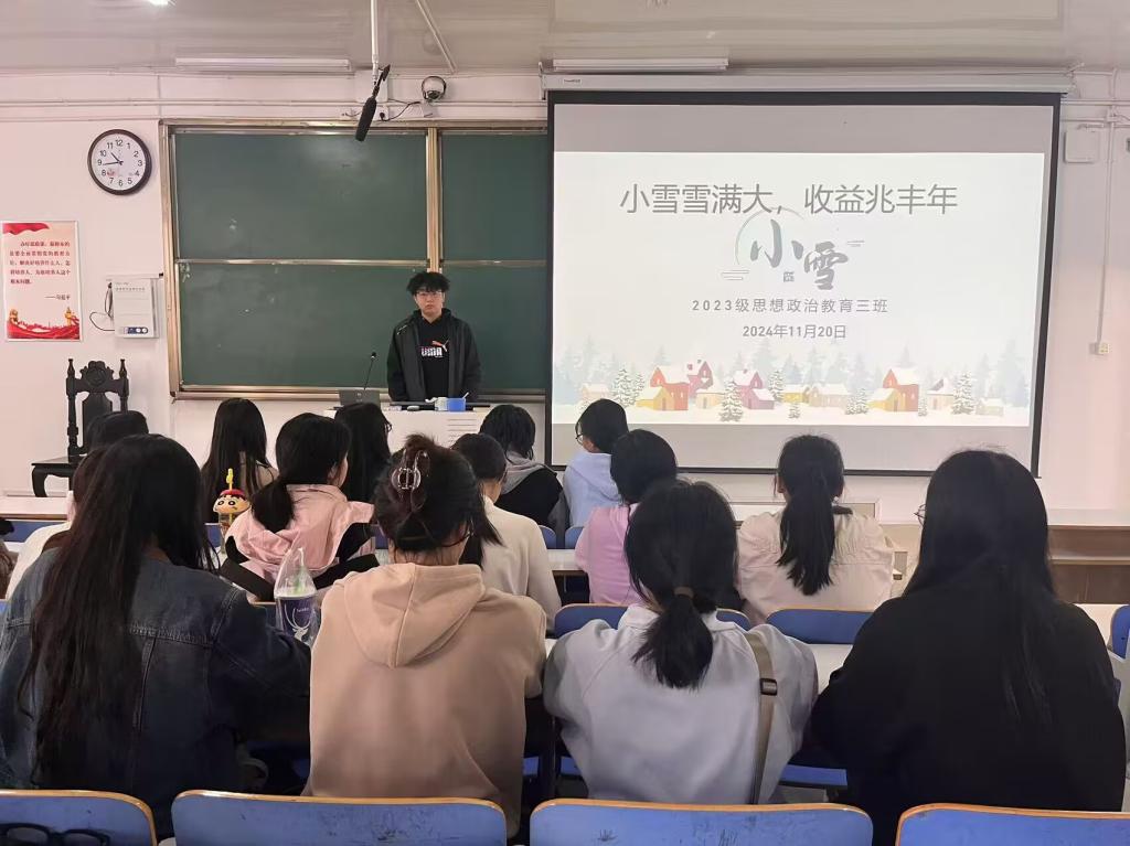 11月20日上午,beat365亚洲版官网2023级思想政治教育三班在社科楼515召开“小雪雪满大,收益兆丰年”主题班会。beat365官网2023级思想政治教育三班全体同学共同参与本次班会,班会由团支书郝瀚主持。