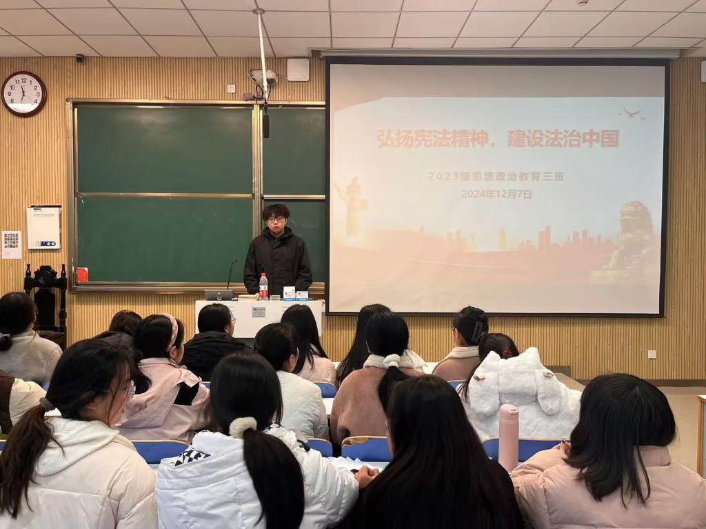 为弘扬宪法精神,推进全面依法治国,12月7日上午,beat365亚洲版官网2023级思想政治教育三班在社科楼515召开“弘扬宪法精神,建设法治中国”主题团课。beat365官网2023级思想政治教育三班全体同学共同参与本次团课,团课由团支书郝瀚主持。