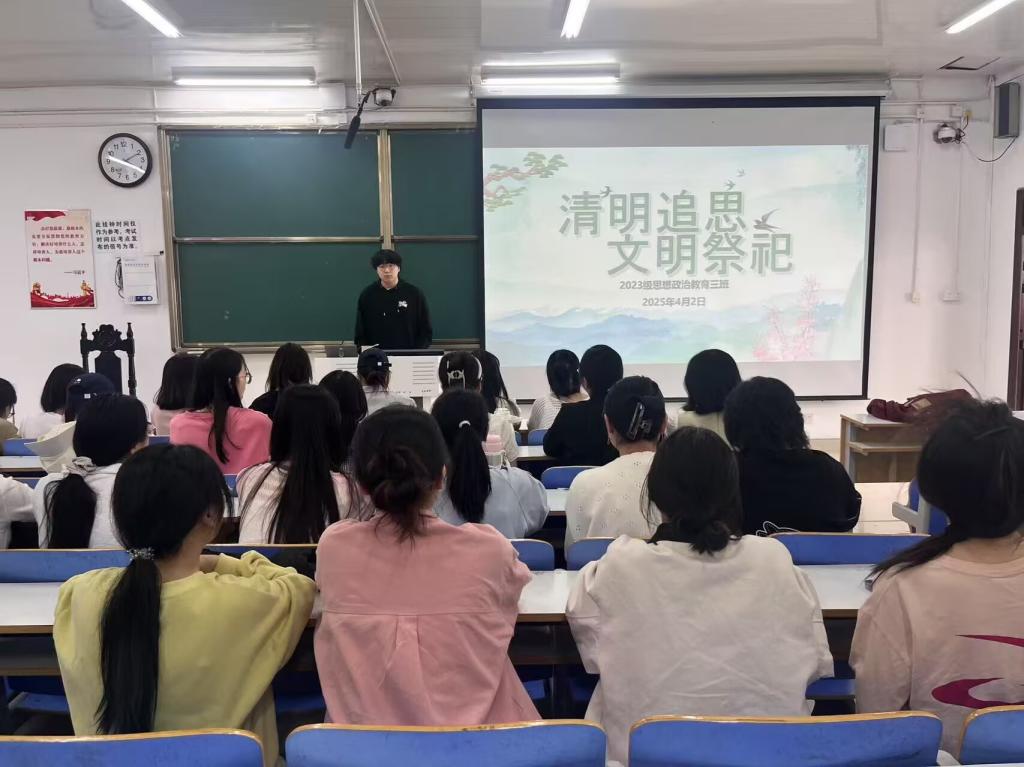 4月2日上午,beat365亚洲版官网2023级思想政治教育三班在社科楼515召开“清明追思,文明祭祀”主题班会。beat365官网2023级思想政治教育三班全体同学共同参与本次班会,班会由团支书郝瀚主持。