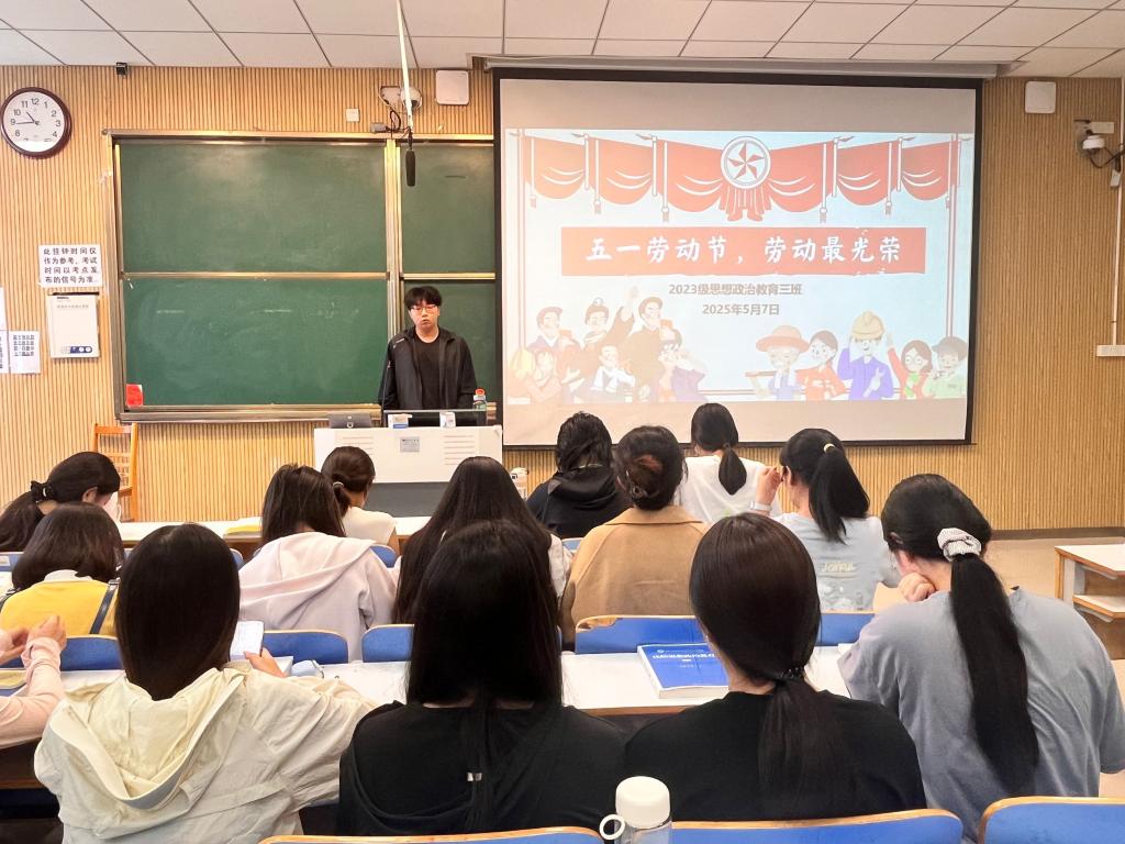 为弘扬劳模精神,发扬劳动传统,5月7日上午,beat365亚洲版官网2023级思想政治教育三班在社科楼515召开“五一劳动节,劳动最光荣”主题班会。beat365官网2023级思想政治教育三班全体同学共同参与本次班会,班会由团支书郝瀚主持。