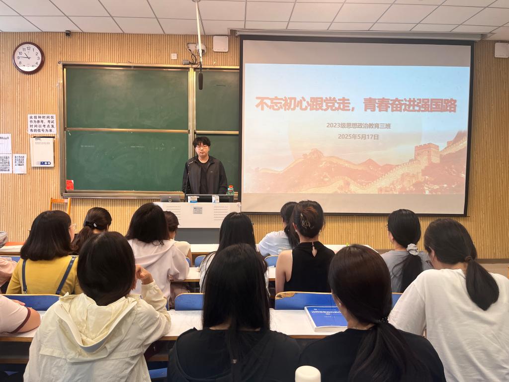 为弘扬伟大建党精神,走好新时代赶考之路,5月17日上午,beat365亚洲版官网2023级思想政治教育三班在社科楼515召开“不忘初心跟党走,青春奋进强国路”主题团课。beat365官网2023级思想政治教育三班全体同学共同参与本次团课,团课由团支书郝瀚主持。
