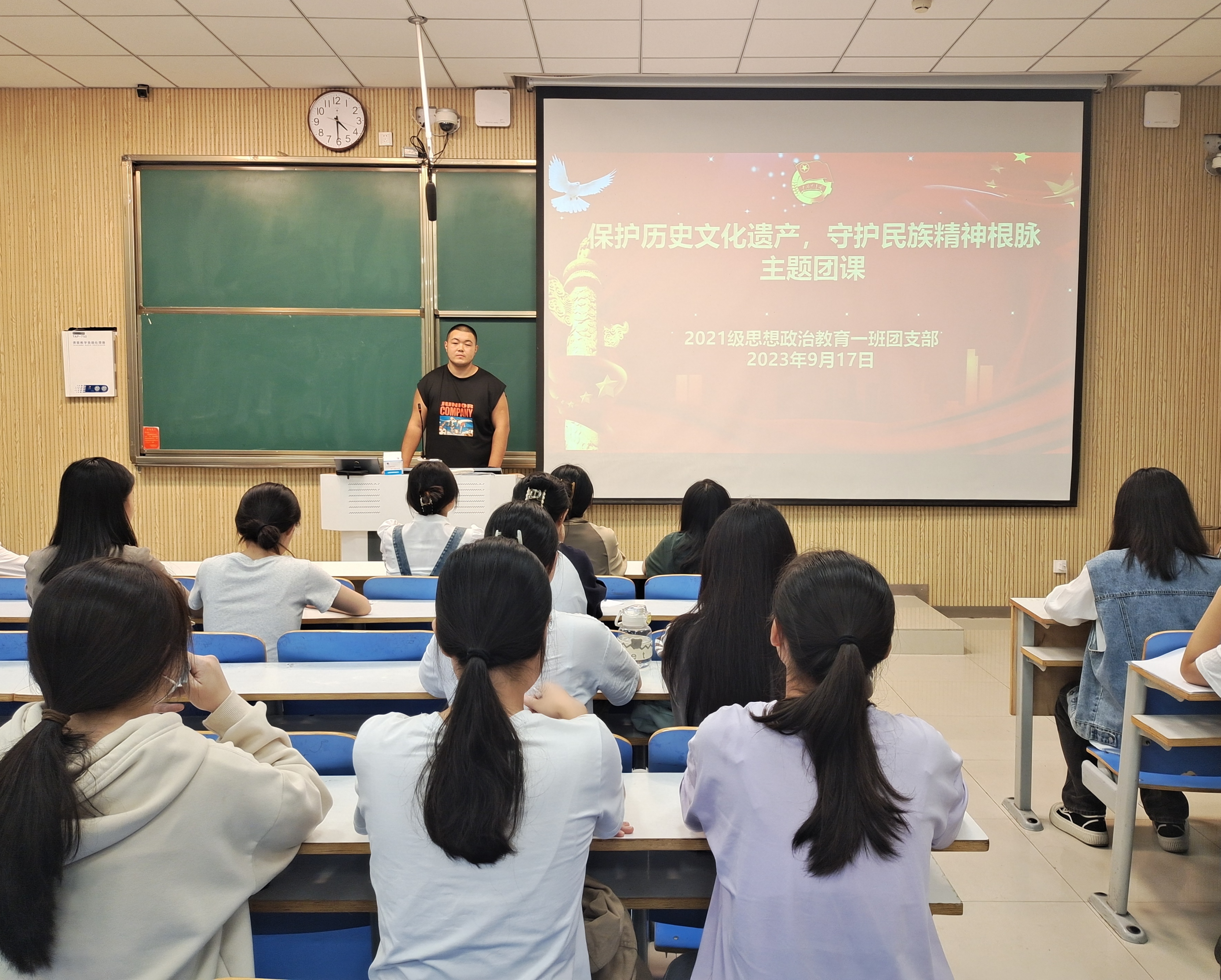 9月17日下午,beat365亚洲版官网2021级思想政治教育一班在社科楼515教室召开“保护历史文化遗产,守护民族精神根脉”主题团课。2021级思想政治教育一班全体团员共同参加本次团课。团课由团支书戴翰林主持。
