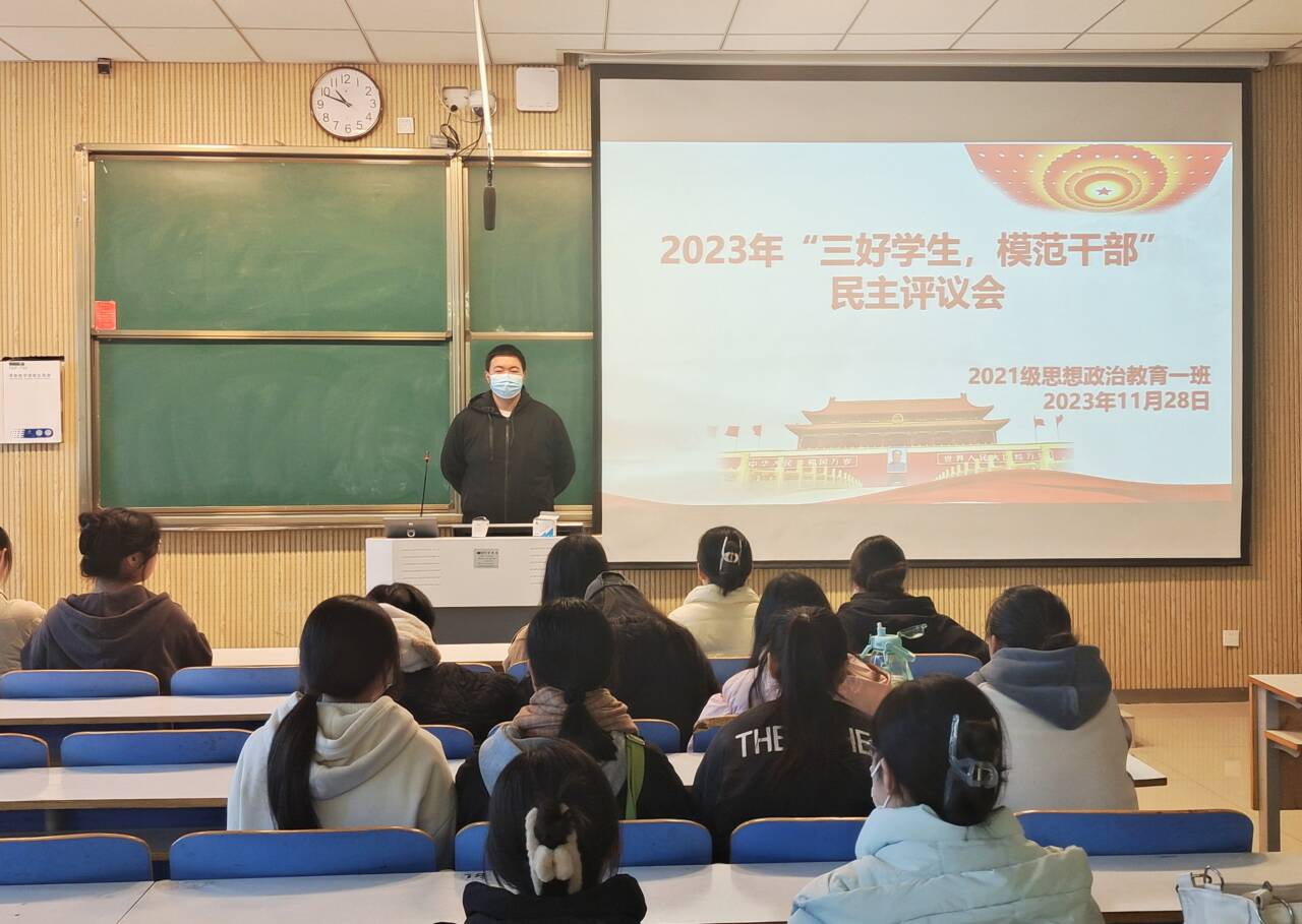 11月28日上午,beat365亚洲版官网2021级思想政治教育一班在社科楼515教室召开2023年“三好学生,模范干部”民主评议会。2021级思想政治教育一班全体成员参加了此次会议。会议由团支书戴翰林主持。
