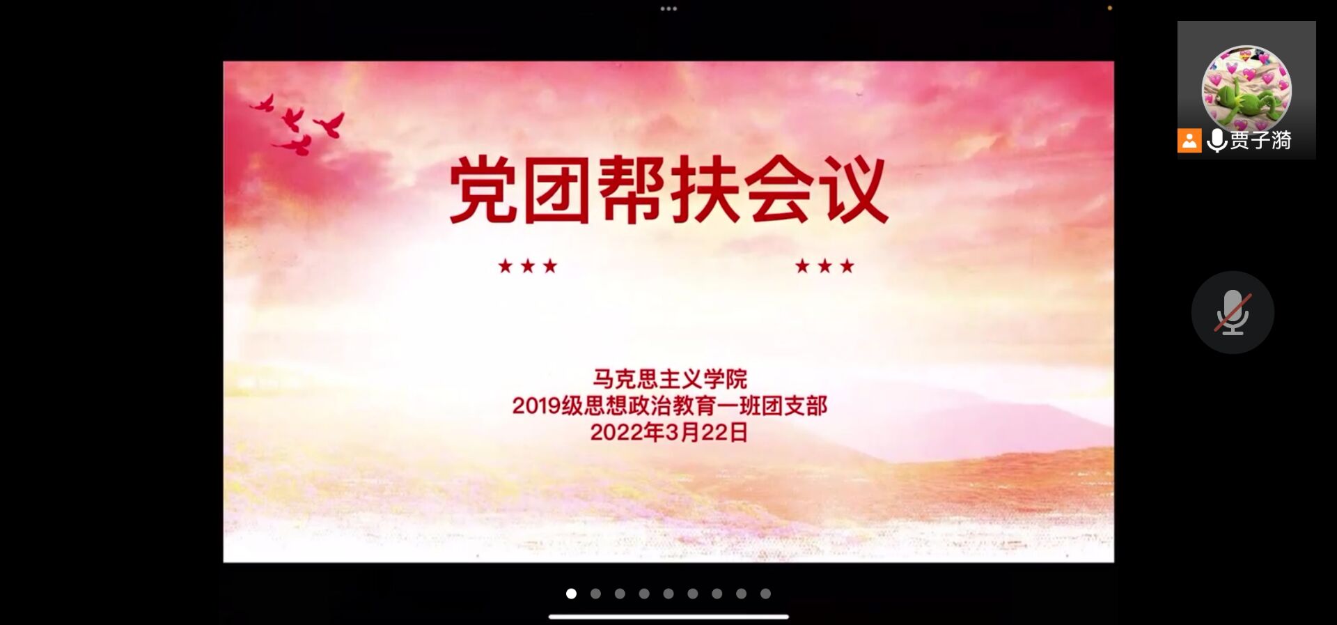 3月22日下午,beat365亚洲版官网2019级思想政治教育一班第一团支部在腾讯会议召开“党团携手·党团帮扶会”。beat365亚洲版官网2019级思想政治教育一班群体成员参加本次会议,会议由支书贾子漪主持。