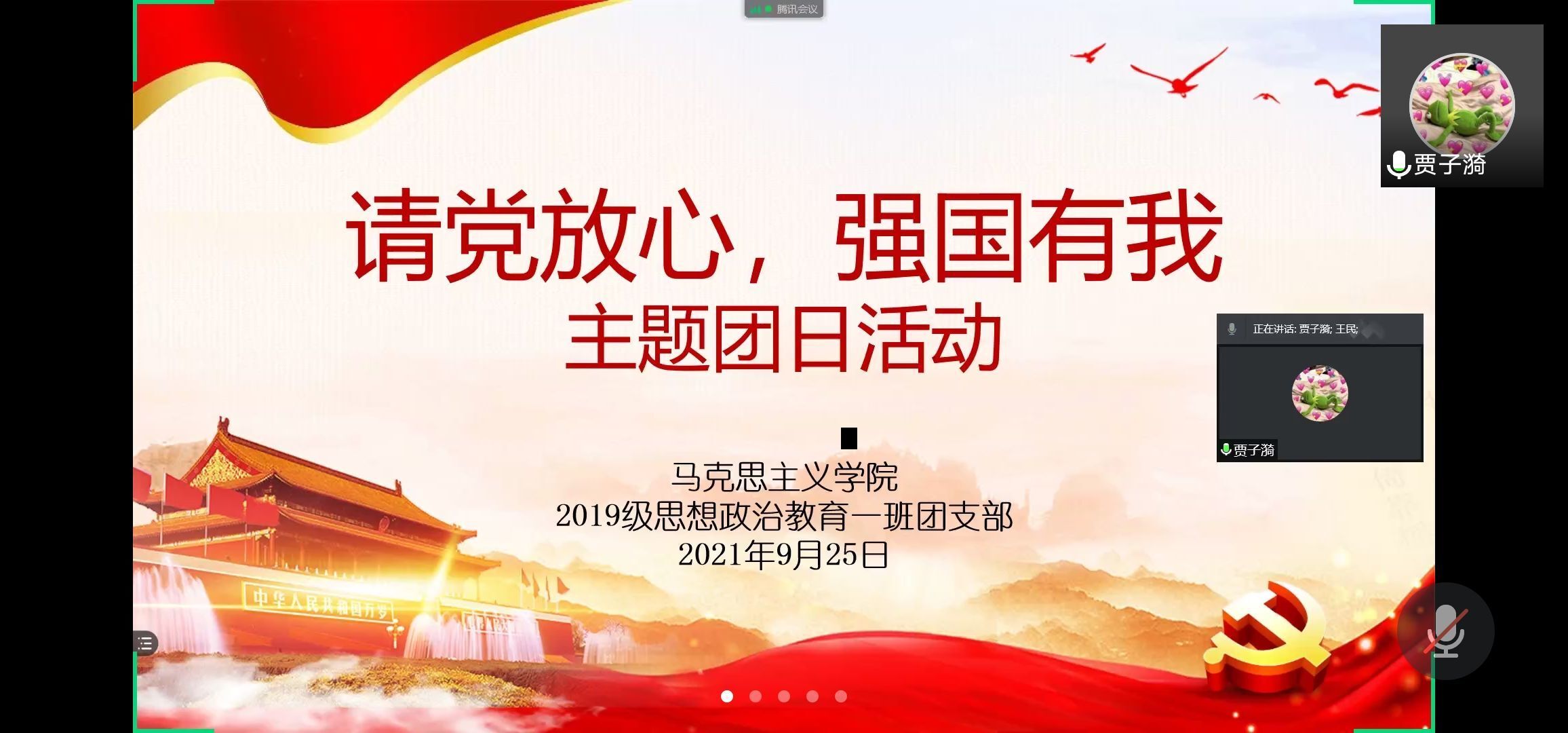 9月25日下午,beat365亚洲版官网2019级思想政治教育一班第一团支部在腾讯视频举办“请党放心,强国有我”主题团日活动。beat365亚洲版官网2019级思想政治教育一班全体团员参加本次活动。活动由团支书贾子漪主持。
