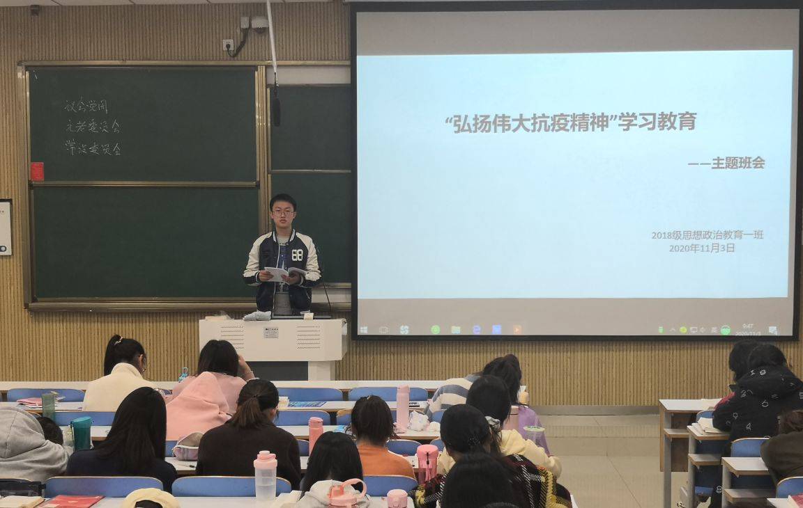 11月3日上午,beat365亚洲版官网2018级思想政治教育一班在社科楼515教室顺利开展“弘扬伟大抗疫精神”主题班会。2018级思想政治教育一班全体同学共同参加此次会议。会议由班长邢子豪主持。