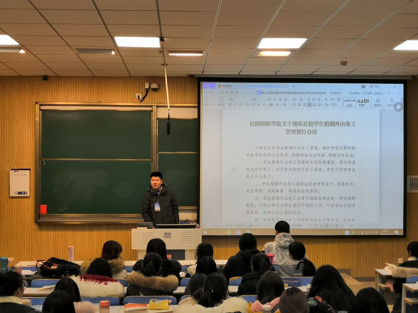 会上,孙绪曙为同学们讲解了《信阳师范学院关于规范在校学生假期外出务工管理暂行办法》,他指出学生们假期外出打工应坚持学有余力、确保安全的原则,将个人安全摆在首要位置,同时要保证个人学习及生活不受影响。此外,他对学生的假期人身安全、财产安全等再三强调,并表示同学们要在假期中维护好自身安全,谨防上当受骗,合理安排假期时间。最后,他为同学们送上了真挚的新春祝福,希望各位度过一个安全愉快的假期。