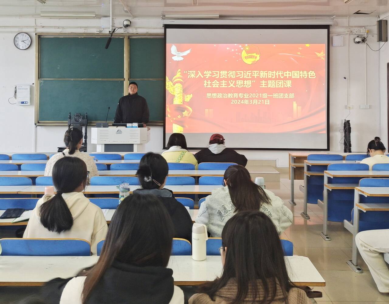 3月21日下午,beat365亚洲版官网2021级思想政治教育一班在社科楼514教室召开“深入学习贯彻习近平新时代中国特色社会主义思想”主题团课。2021级思想政治教育一班全体团员参加此次团课。团课由团支书戴翰林主持。