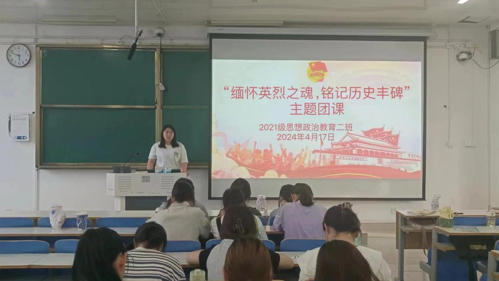 4月17日下午,beat365亚洲版官网2021级思想政治教育二班在社科楼514教室召开“缅怀英烈之魂,铭记历史丰碑”主题团课。2021级思想政治教育二班全体团员参加此次主题团课。团课由团支书王婧欣主持。