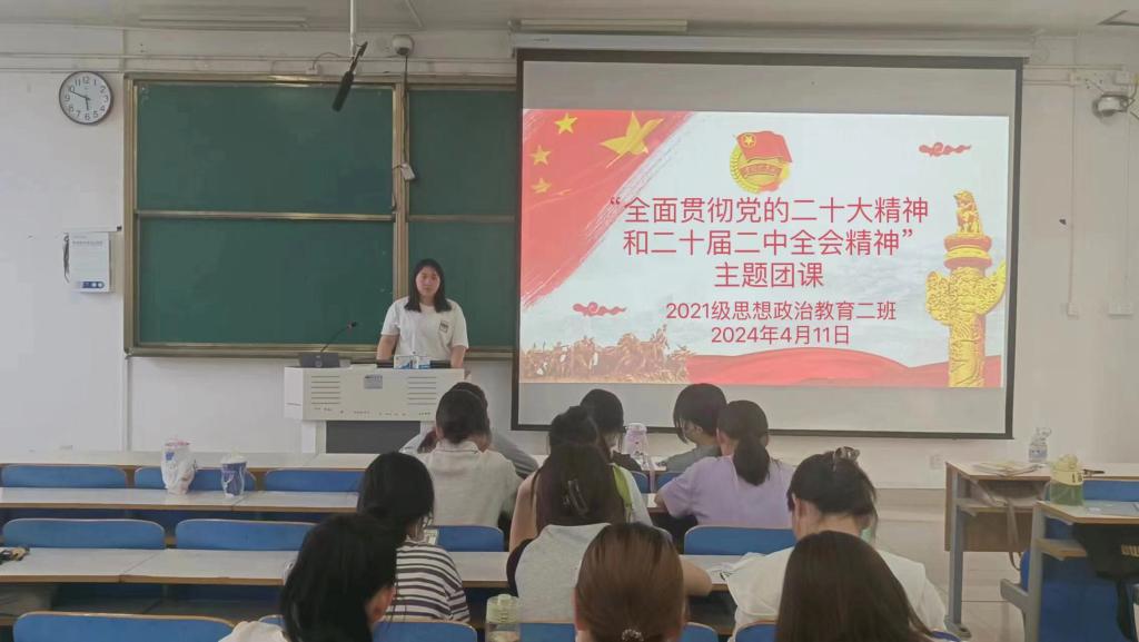 4月11日下午,beat365亚洲版官网2021级思想政治教育二班在社科楼514教室召开“全面贯彻党的二十大精神和二十届二中全会精神”主题团课。2021级思想政治教育二班全体团员参加此次团课。团课由团支书王婧欣主持。