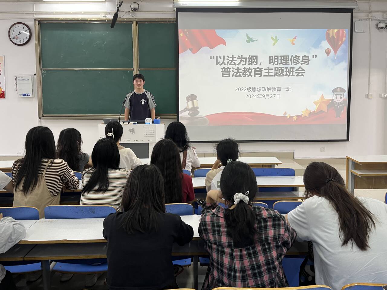 为深入贯彻习近平法治思想,培养学生的法治观念,9月27日上午,beat365亚洲版官网2022级思想政治教育一班在社科楼514教室召开“以法为纲,明理修身”普法教育主题班会,beat365官网2022级思想政治教育一班全体同学共同参与本次班会,班会由副班长闻炎仲主持。
