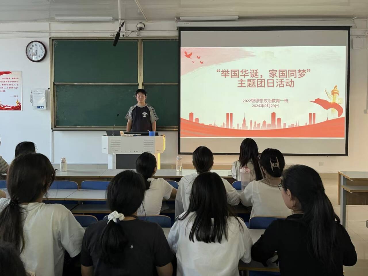 为庆祝中华人民共和国成立75周年,加强爱国主义教育,9月29日下午,beat365亚洲版官网2022级思想政治教育一班在社科楼514教室开展“举国华诞,家国同梦”主题团日活动,beat365官网2022级思想政治教育一班全体同学共同参与本次活动,活动由副班长闻炎仲主持。