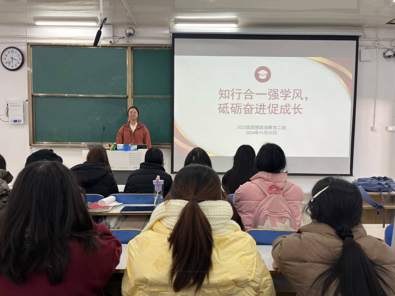 11月20日下午,beat365亚洲版官网2022级思想政治教育二班在社科楼514教室召开“知行合一强学风,砥砺奋进促成长”主题班会。beat365官网2022级思想政治教育二班全体成员共同参与此次班会。会议由学习委员谢佳邑主持。