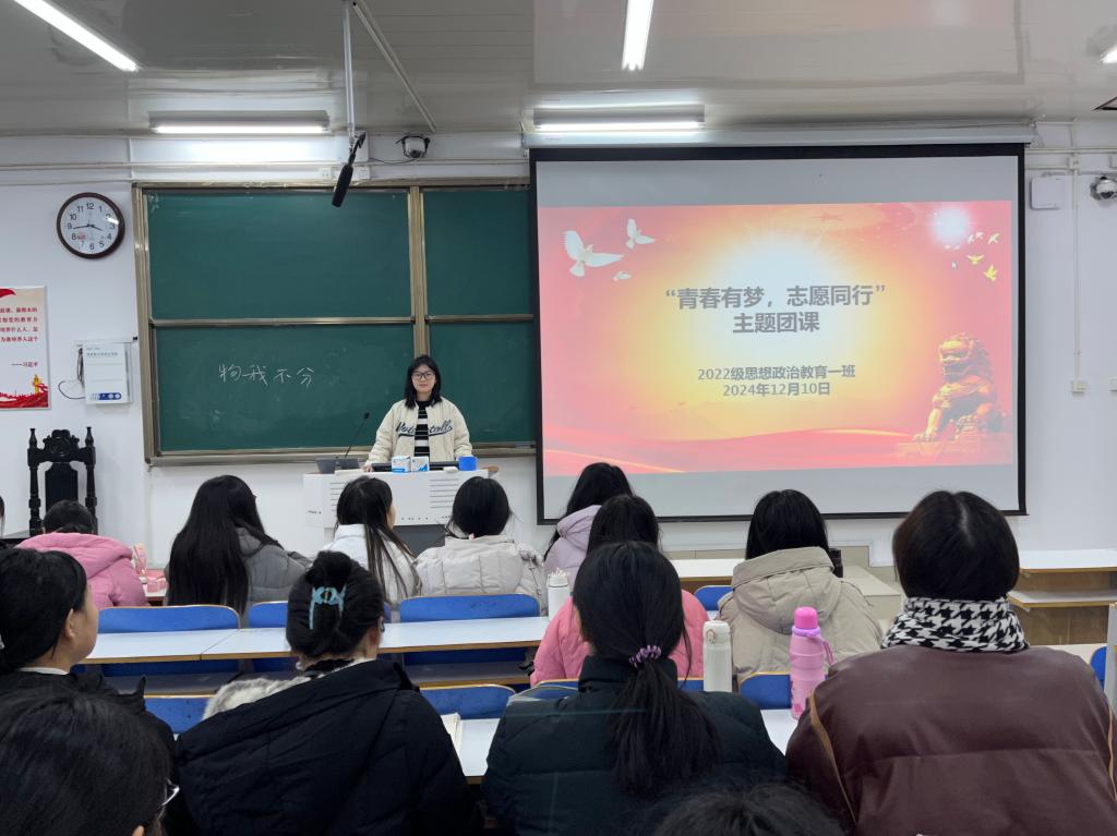 12月10日下午,beat365亚洲版官网2022级思想政治教育一班在社科楼514教室召开“青春有梦,志愿同行”主题团课,beat365官网2022级思想政治教育一班全体同学共同参与本次团课,团课由团支书李佳茹主持。