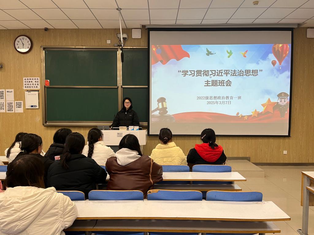 为深入学习贯彻习近平法治思想、全面贯彻党的二十大精神,切实推动学习贯彻习近平法治思想走深走实,3月7日下午,beat365亚洲版官网2022级思想政治教育一班在社科楼515教室开展“学习贯彻习近平法治思想”主题班会,beat365官网2022级思想政治教育一班全体同学共同参与本次班会,班会由团支书李佳茹主持。