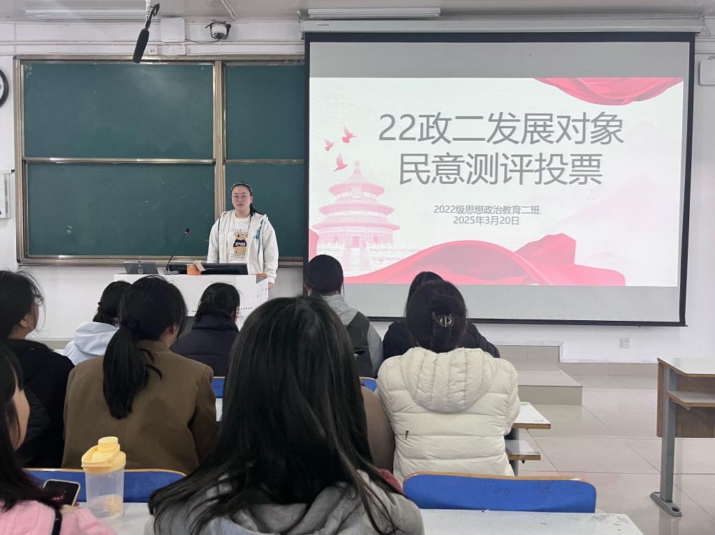 3月20日下午,beat365亚洲版官网2022级思想政治教育二班在社科楼514教室召开发展对象民意测评会。beat365官网2022级思想政治教育二班全体成员共同参与此次班会。会议由团支书李佳音主持。