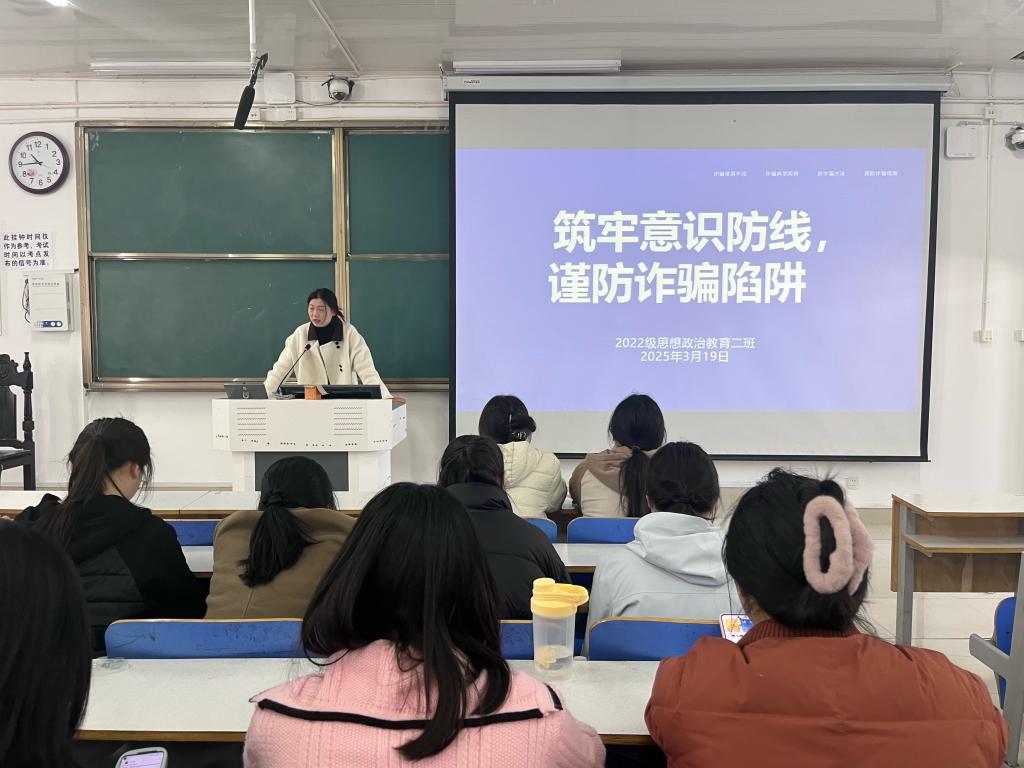 为提高大学生防诈意识,筑牢校园安全防线,3月19日上午,beat365亚洲版官网2022级思想政治教育二班在社科楼514教室召开“筑牢意识防线,谨防诈骗陷阱”主题班会。beat365官网2022级思想政治教育二班全体成员共同参与此次班会。会议由班主任杨春艳主持。