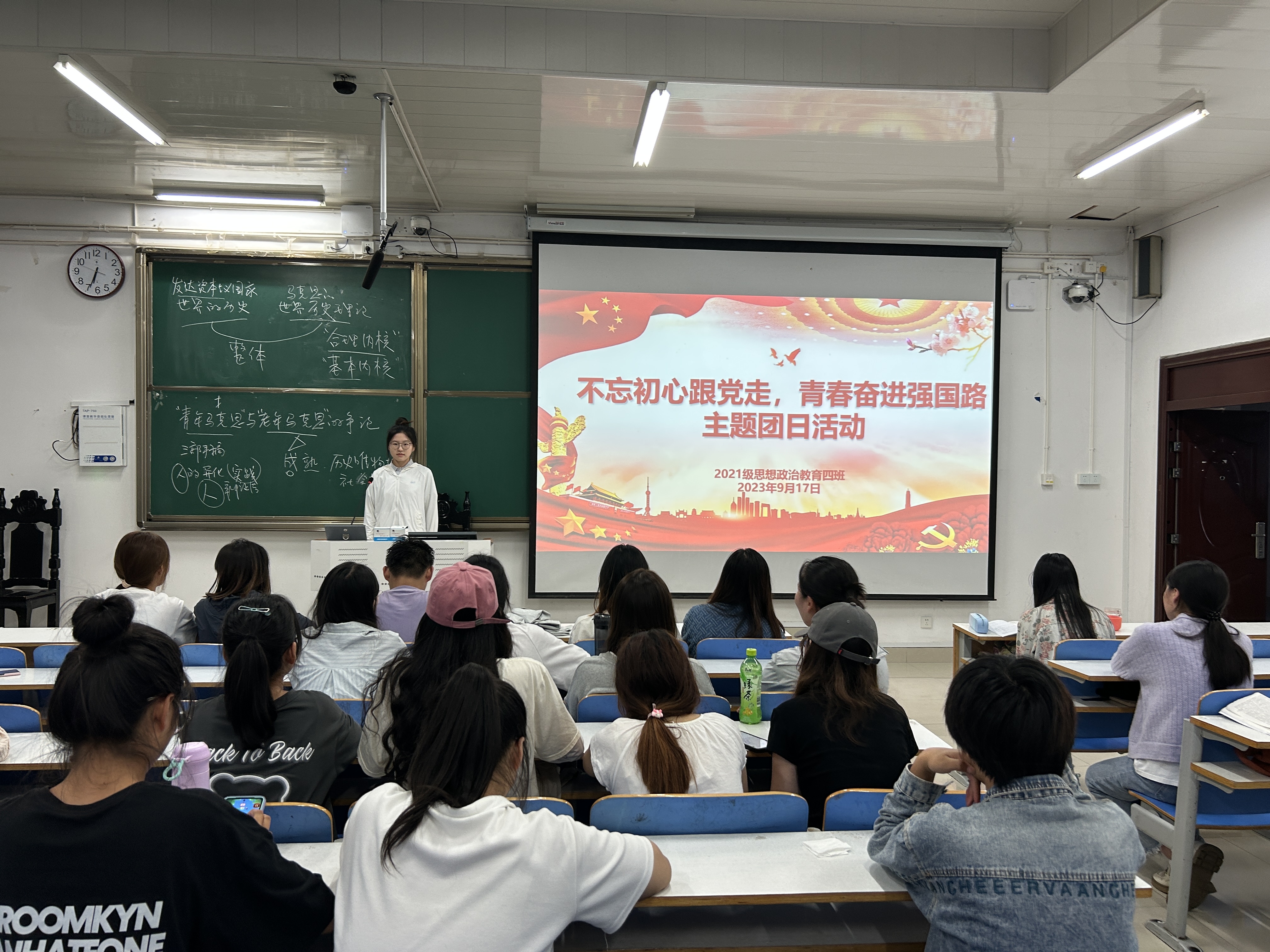 9月17日下午,beat365亚洲版官网2021级思想政治教育四班在社科楼515教室召开“不忘初心跟党走,青春奋进强国路”主题团日活动。2021级思想政治教育四班全体团员共同参加本次团课。团课由团支书刘珂含主持。
