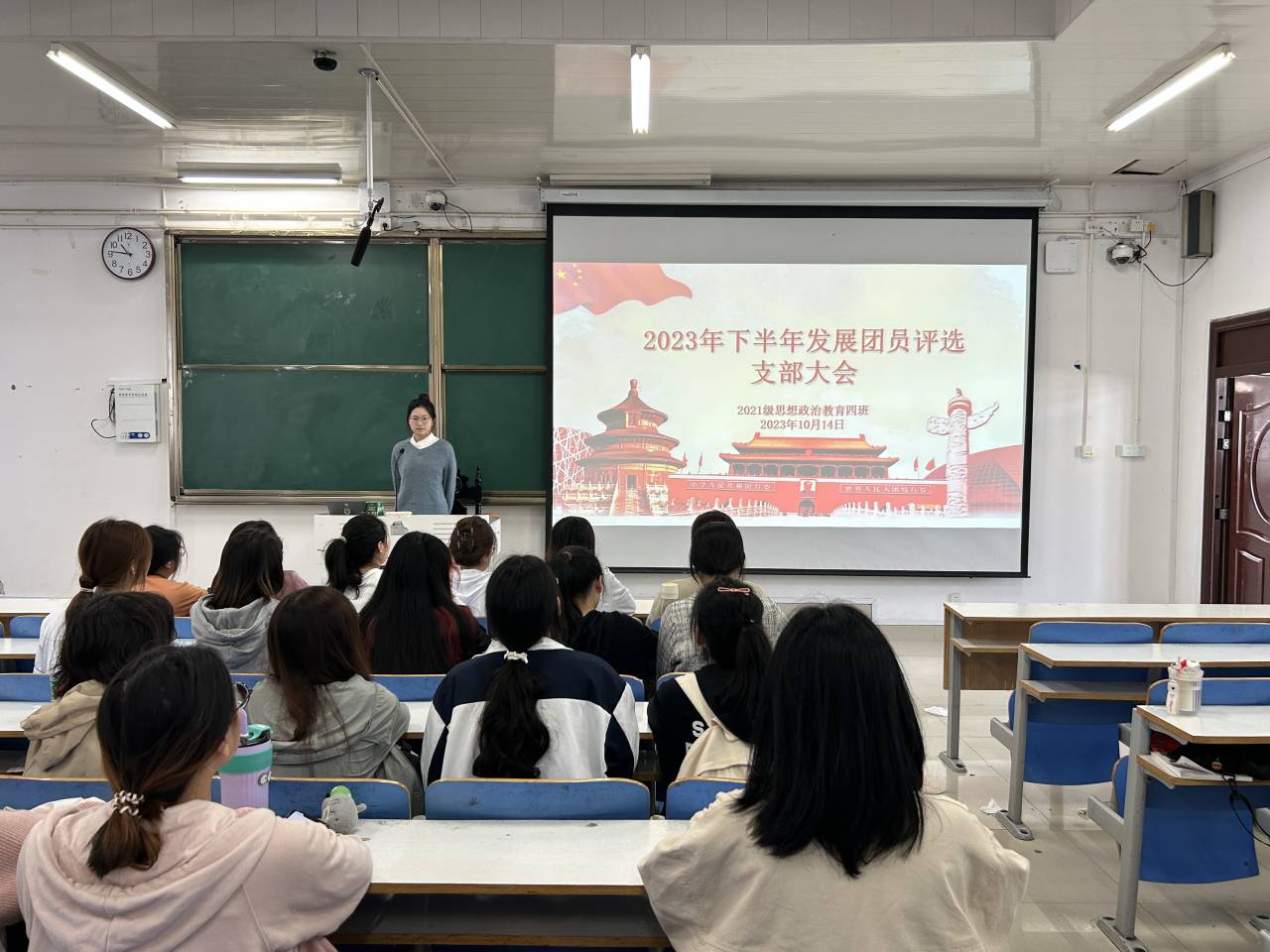10月14日下午,beat365亚洲版官网2021级思想政治教育四班召开2023下半年发展团员评选支部大会。2021级思想政治教育四班全体团员共同参会。会议由团支书刘珂含主持。