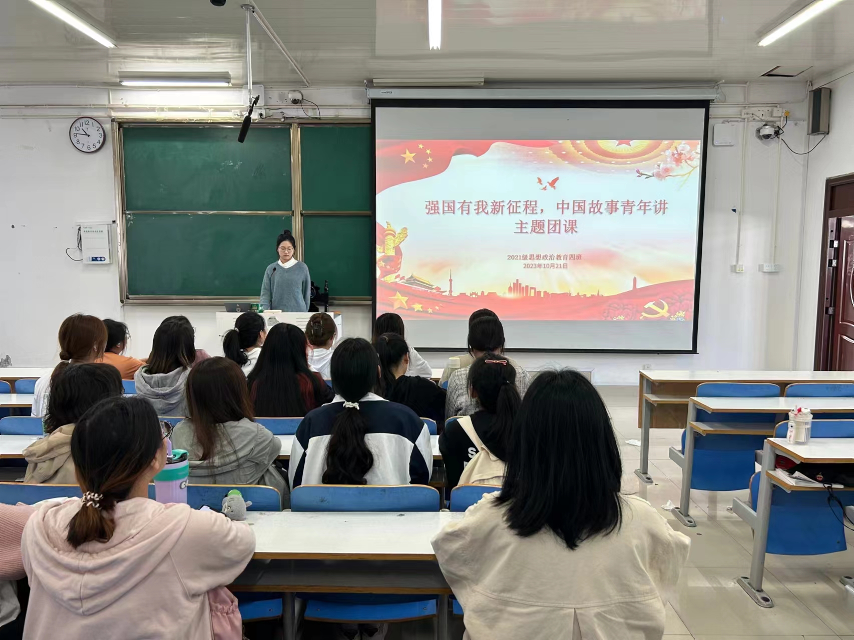 10月21日下午,beat365亚洲版官网2021级思想政治教育四班在社科楼514教室开展“强国有我新征程,中国故事青年讲”主题团课。2021级思想政治教育四班全体学生共同参加本次团课。团课由团支书刘珂含主持。