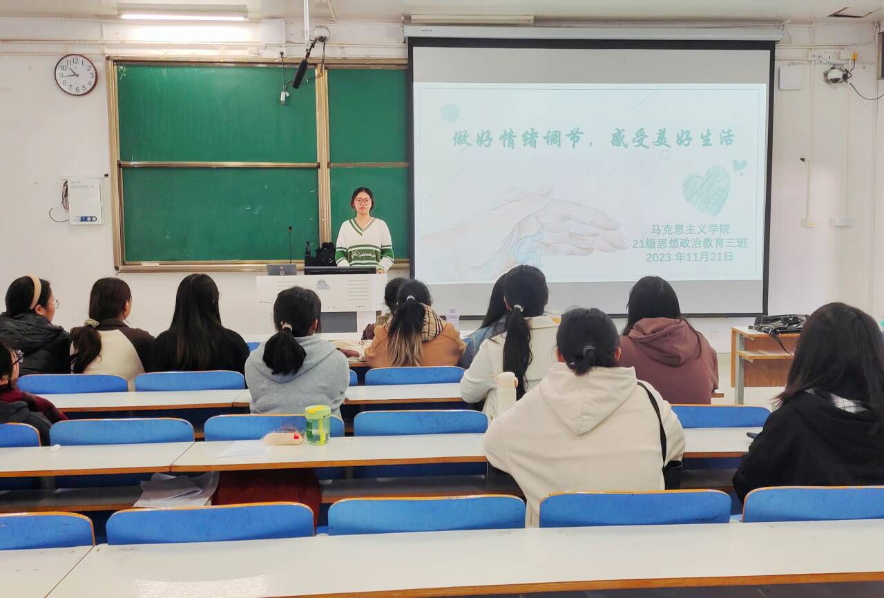 11月21日下午,beat365亚洲版官网2021级思想政治教育三班在社科楼514教室举办“做好情绪调节,感受美好生活”主题团课。2021级思想政治教育三班全体成员参加了此次会议。会议由心理委员许竞文主持。