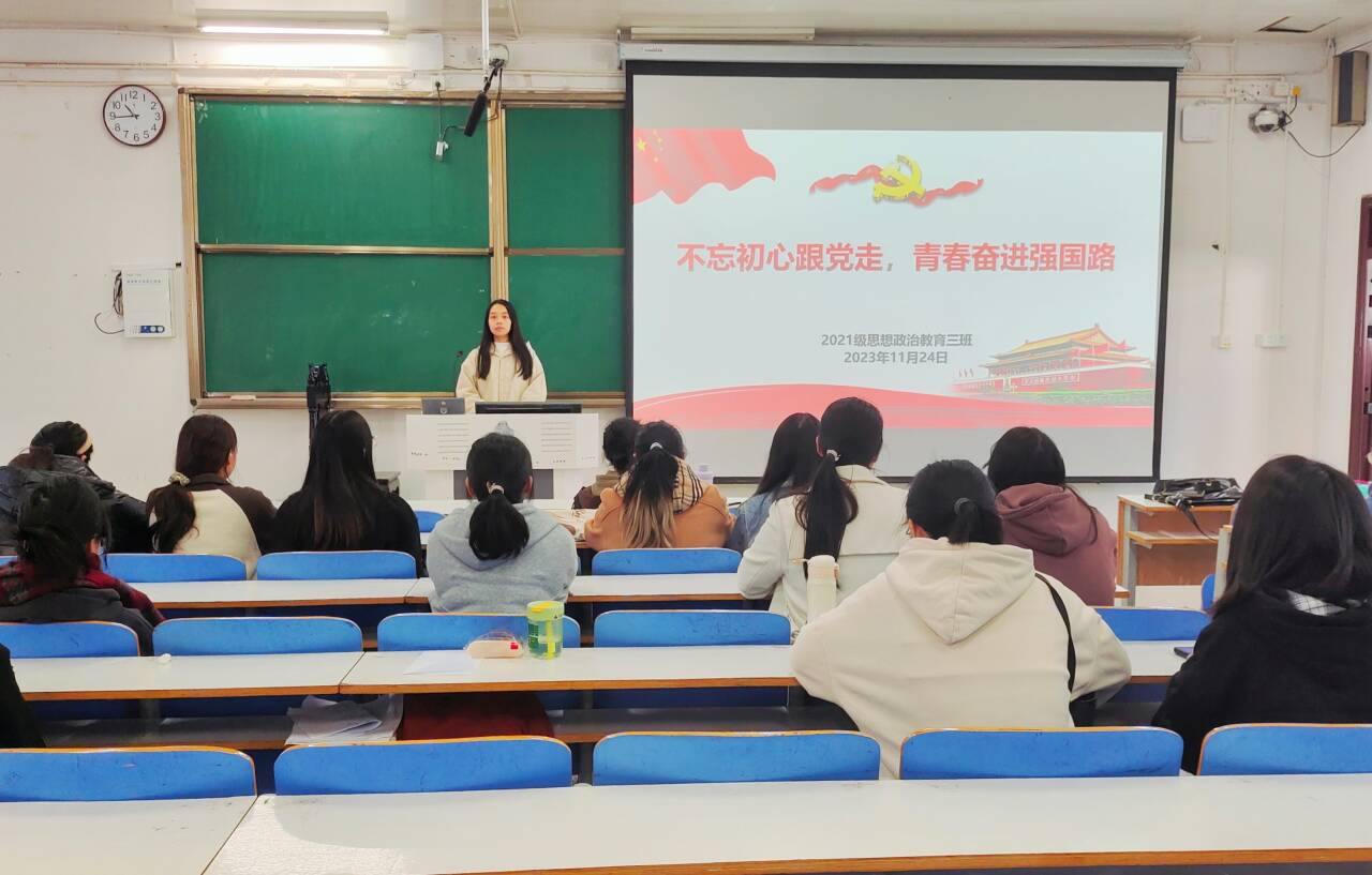 11月24日下午,beat365亚洲版官网2021级思想政治教育三班在社科楼514教室举办“不忘初心跟党走,青春奋进强国路”主题团课。2021级思想政治教育三班全体团员参加了此次团课。团课由团支书王岚霄主持。