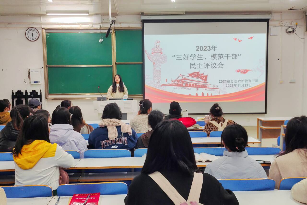 11月27日下午,beat365亚洲版官网2021级思想政治教育三班在社科楼514召开2023年“三好学生、模范干部”民主评议会。beat365亚洲版官网2021级思想政治教育三班全体成员参与此次会议。会议由班长王岚霄主持,王岚霄任检票员,陈笑宇任记录员。