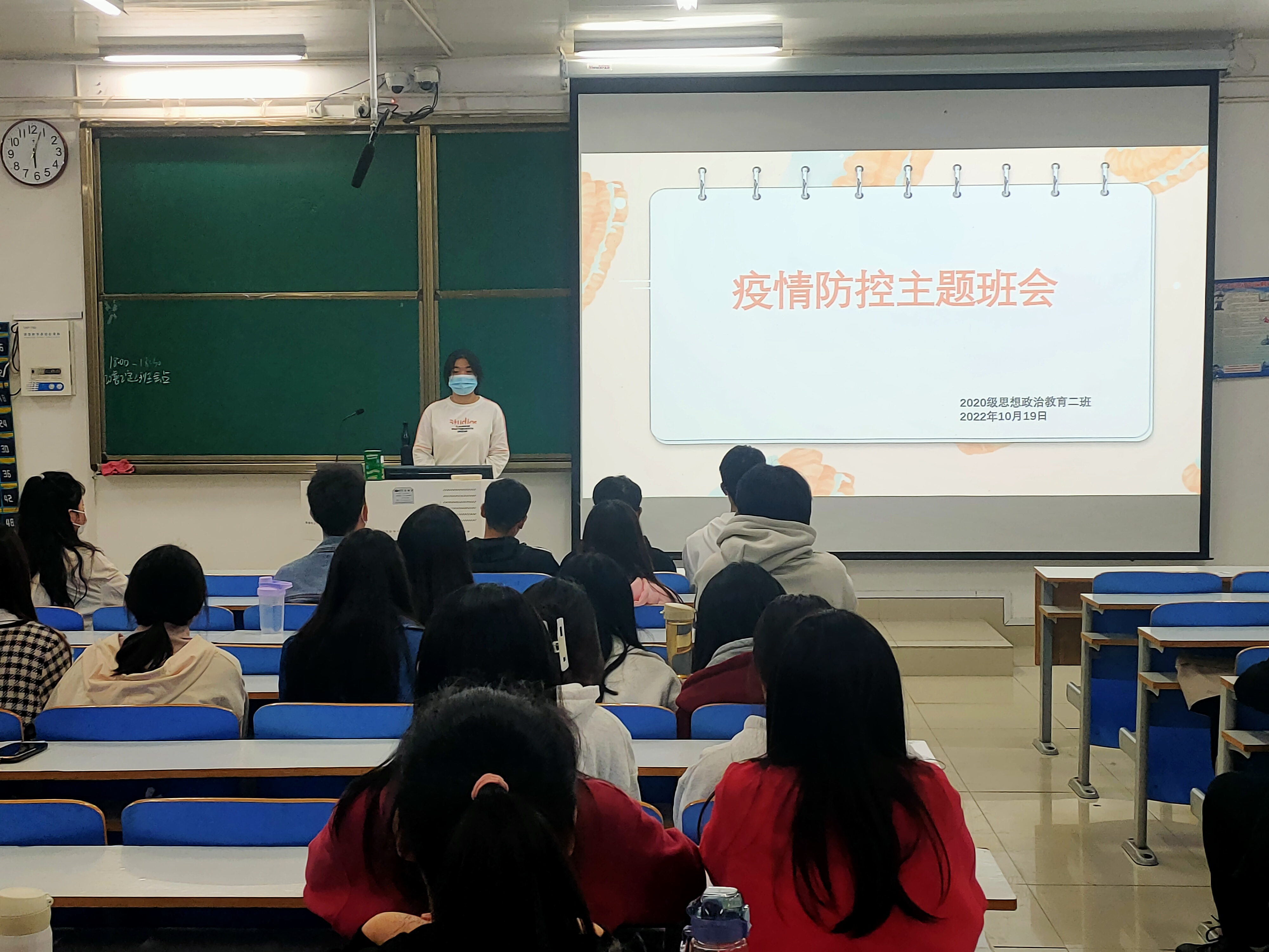 鉴于当前疫情防控的严峻形势,为进一步提高同学们对疫情防控工作的重视程度,10月19日下午,beat365亚洲版官网2020级思想政治教育二班、定向二班在社科楼514教室召开疫情防控主题班会。二班、定向二班全体同学参与此次会议。班会由班长孙雪主持。