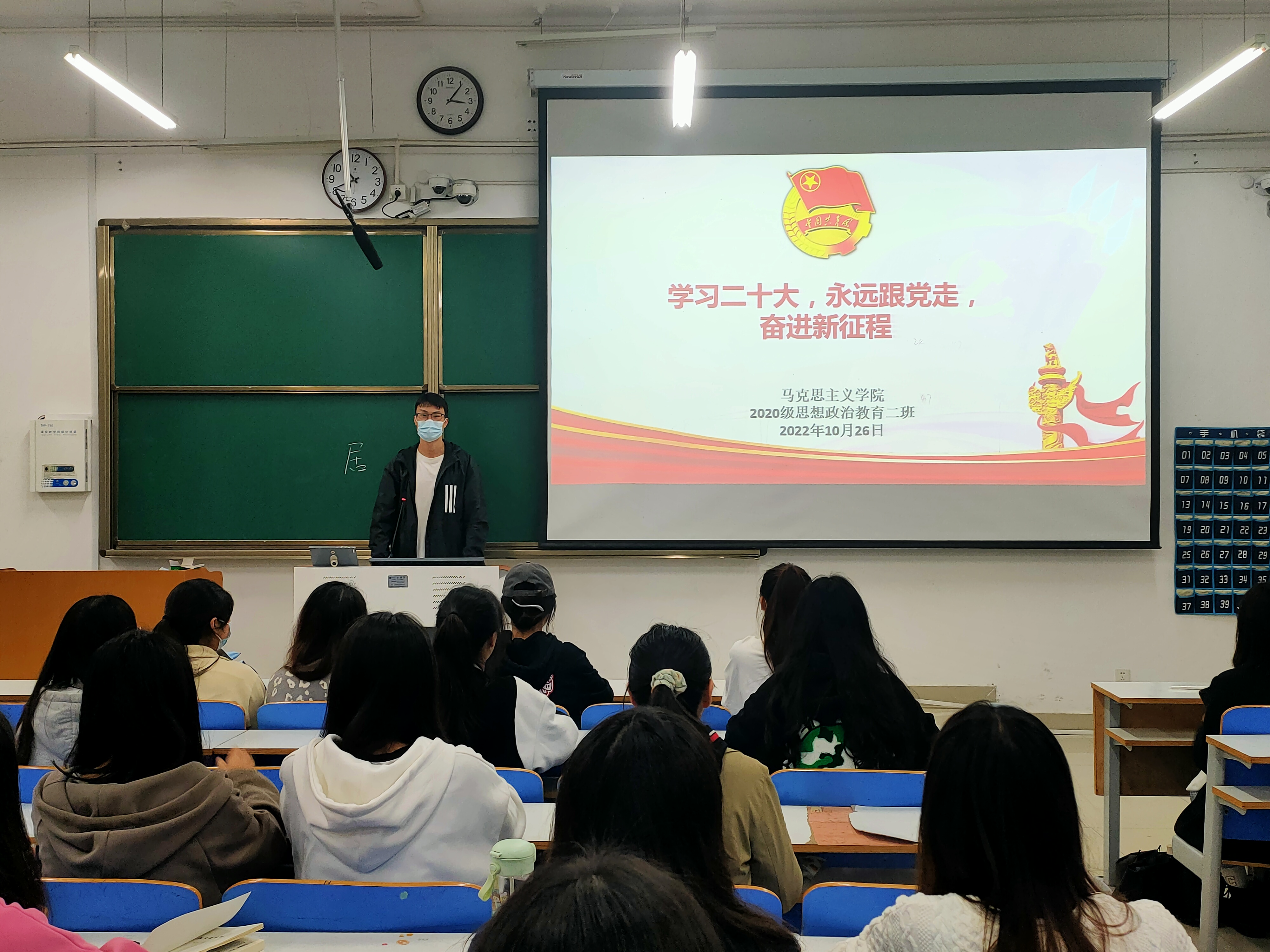 为深入学习贯彻中国共产党第二十次全国代表大会重要会议精神,10月26日下午,beat365亚洲版官网2020级思想政治教育二班、定向二班在社科楼415教室召开“学习二十大,永远跟党走,奋进新征程”主题班会。二班、定向二班全体学生共同参与本次班会。班会由团支书陈宇航主持。