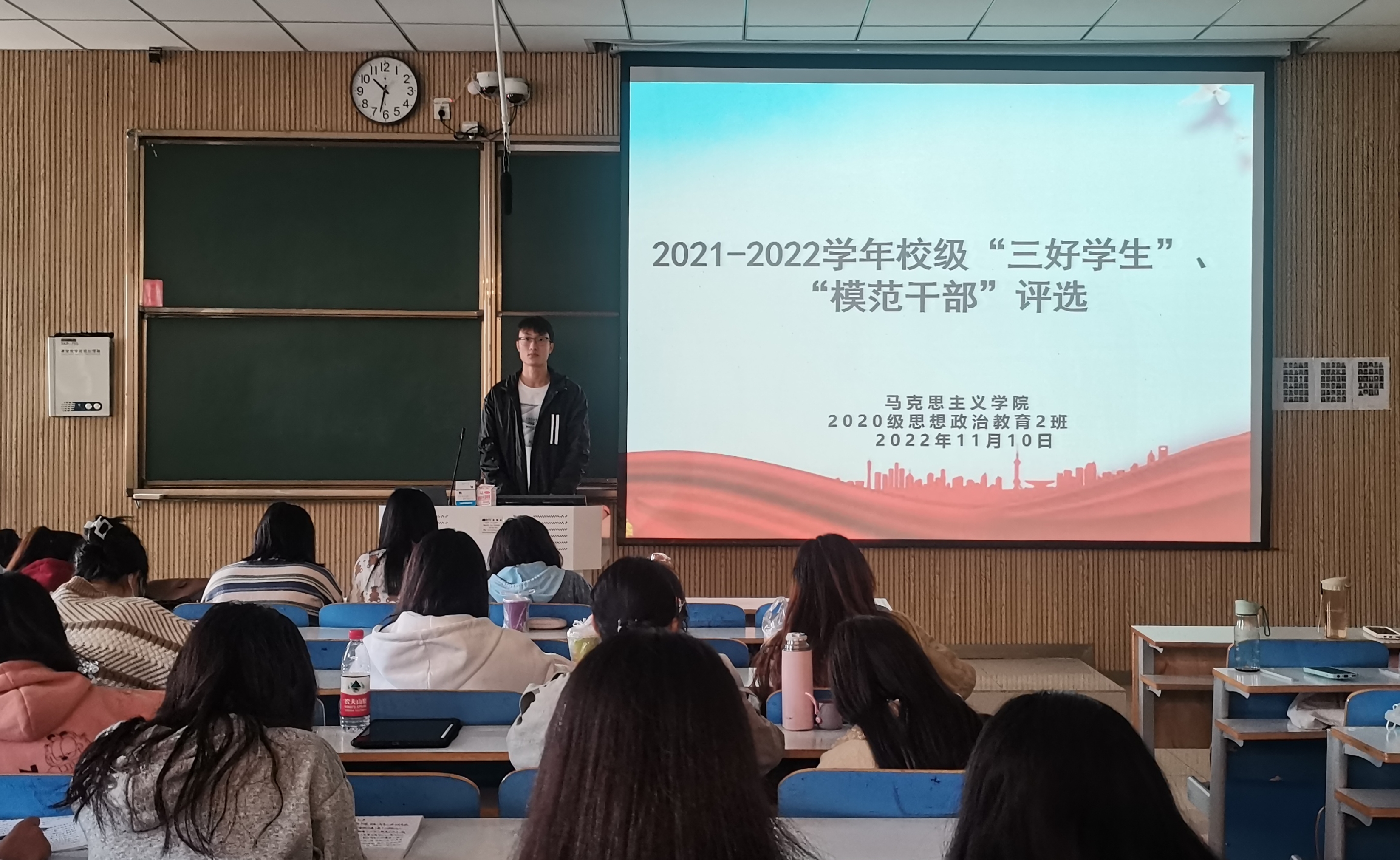 11月10日上午,beat365亚洲版官网2020级思想政治教育二班、定向二班在社科楼515教室召开2021-2022学年校级“三好学生”“模范干部”评选会。二班、定向二班全体同学共同参与本次会议。会议由团支书陈宇航主持。