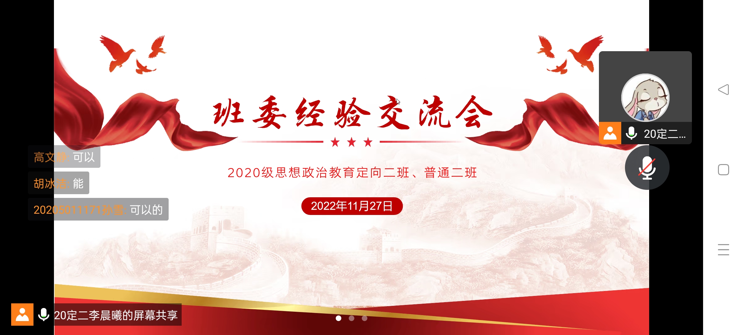 11月27日晚上,beat365亚洲版官网2020级思想政治教育二班、定向二班通过腾讯会议召开线上班委经验交流会。二班、定向二班全体班委参加本次会议。会议由团支书李晨曦主持。