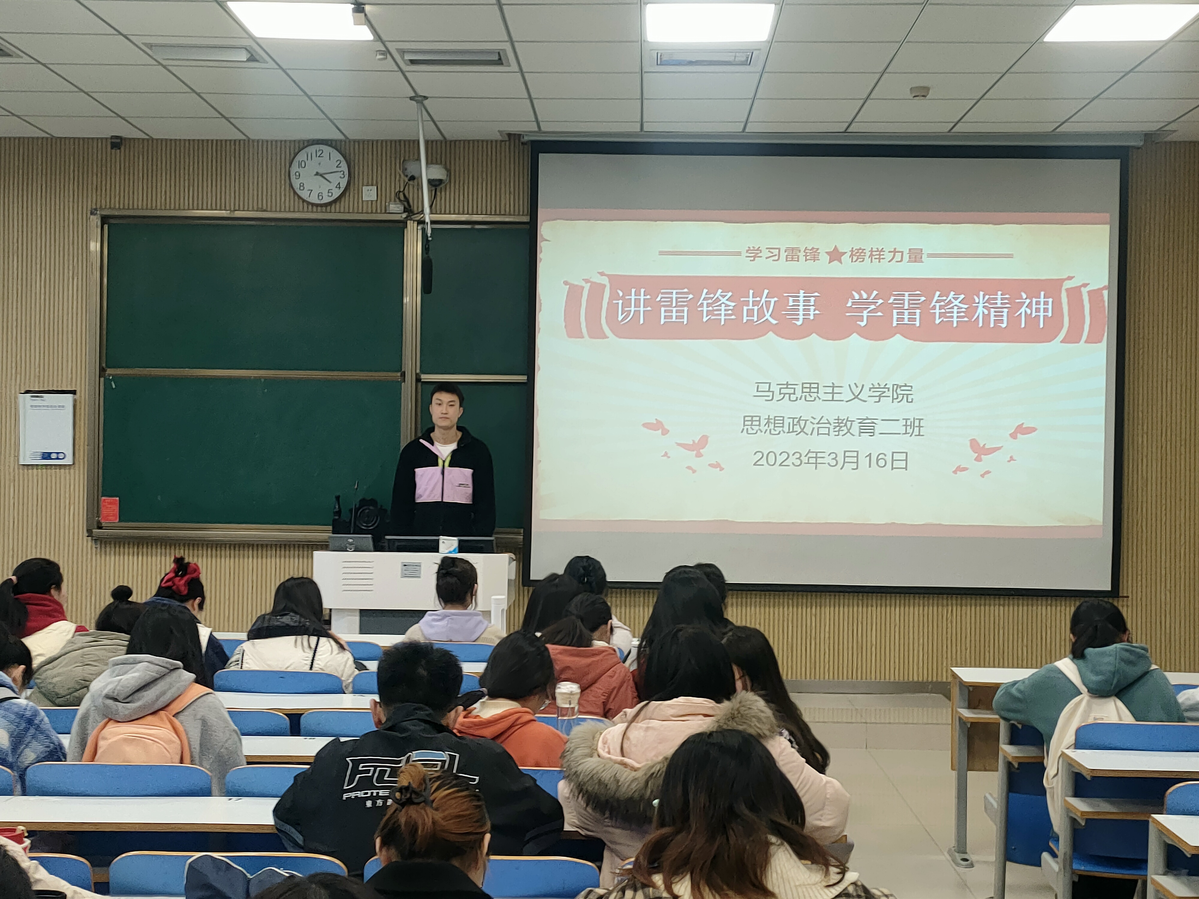 为引导我班团员积极学习并践行雷锋精神,3月16日下午,beat365亚洲版官网2020级思想政治教育二班、定向二班团支部在社科楼515教室开展“讲雷锋故事,学雷锋精神”主题团课。二班、定向二班全体团员共同参与本次团课。团课由团支书陈宇航主持并讲授。