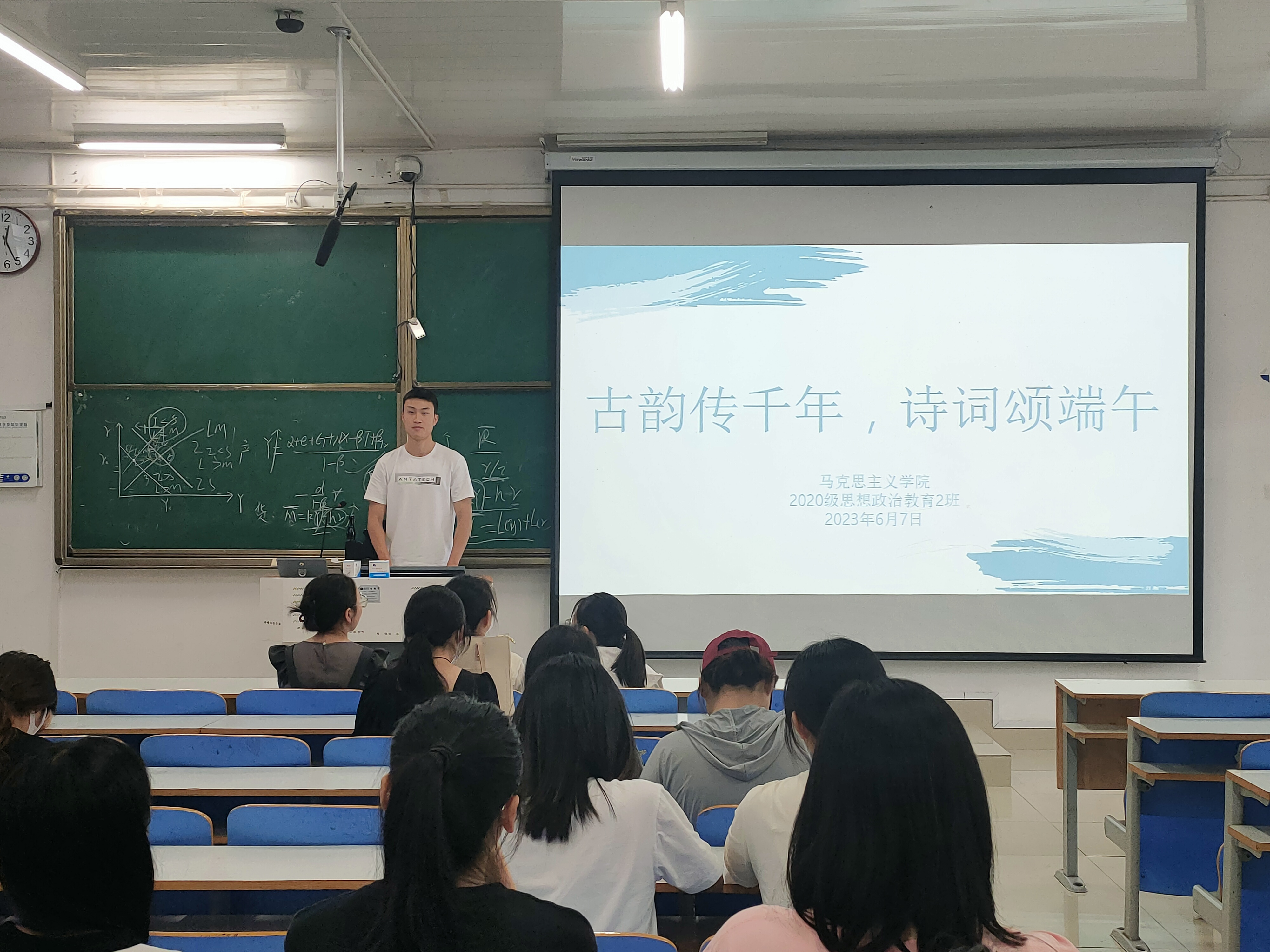 为增进我班同学对中华优秀传统文化的了解,进一步厚植文化自信,6月7日上午,beat365亚洲版官网2020级思想政治教育二班、定向二班在社科楼514教室开展“古韵传千年,诗词颂端午”主题团课。二班、定向二班全体同学共同参与本次团课。团课由团支书陈宇航主持。