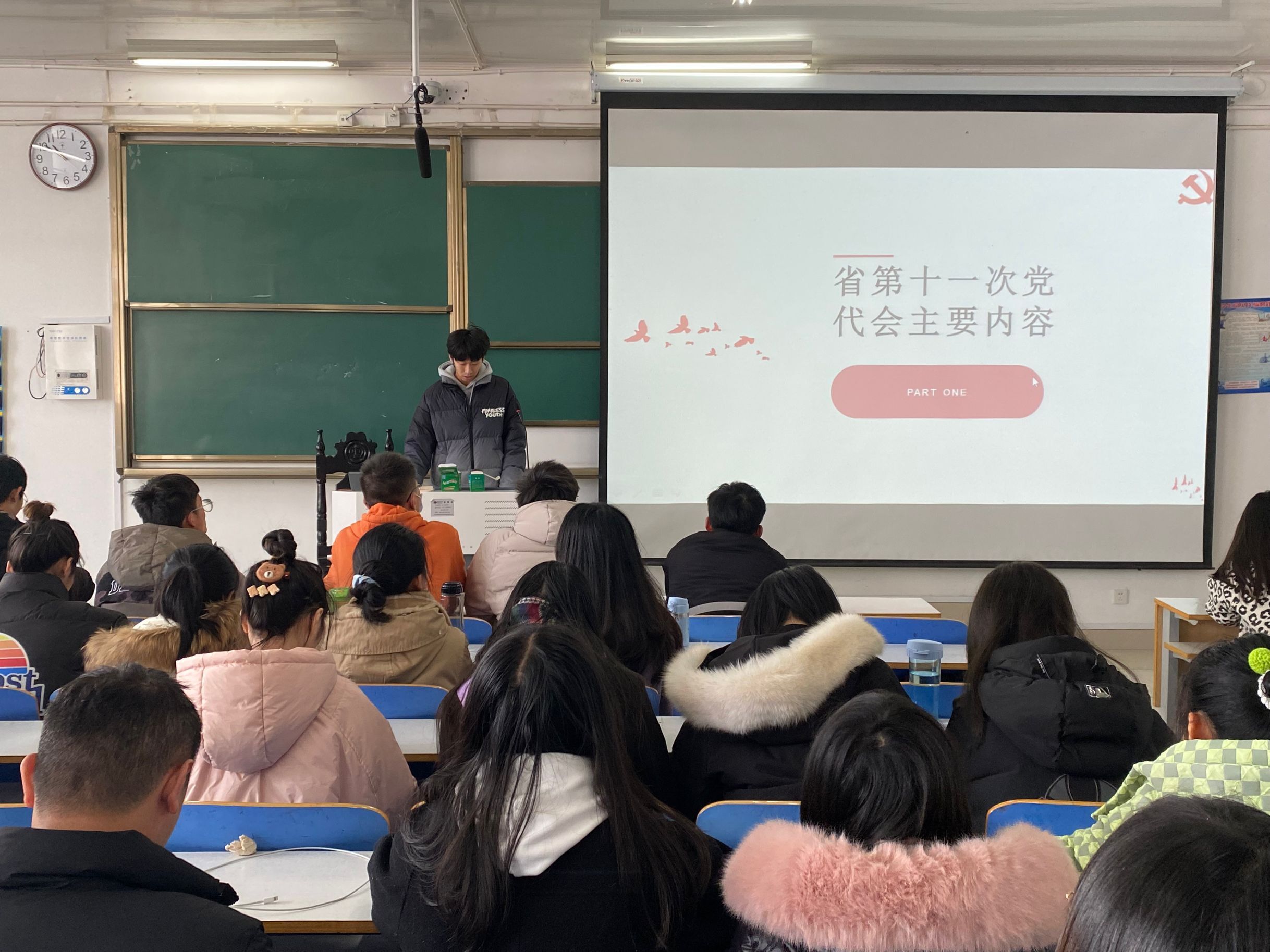 首先,吕昂就省第十一次党代会召开背景和具体情况作了简要说明。他指出,河南省第十一次党代会是在我们党百年华诞的历史节点、在开启全面建设社会主义现代化河南新征程的重要时刻召开的一次重要大会,它绘就了波澜壮阔的宏伟蓝图,具有里程碑意义。作为青年团员应自觉学习并积极宣传省第十一次党代会精神。接着,吕昂带领同学们围绕省第十一次党代会主要内容、代表报告、会议精神等三方面内容进行深入学习与交流。他提到,学习大会的主要精神,就要深入剖析楼阳生同志代表十届省委所作的题为《高举伟大旗帜牢记领袖嘱托 为确保高质量建设现代化河南 确保高水平实现现代化河南而努力奋斗》的报告,要明确其中蕴含的“牢记领袖嘱托、做到‘两个确保’”鲜明主题、“奋勇争先、更加出彩”会议主线、依靠创新驱动高质量发展等主体思想。最后,他希望同学们做到学习领会会议精神与党史学习教育有机结合起来,原原本本学,深入思考学,联系实际学,推动会议精神入脑入心、融会贯通。