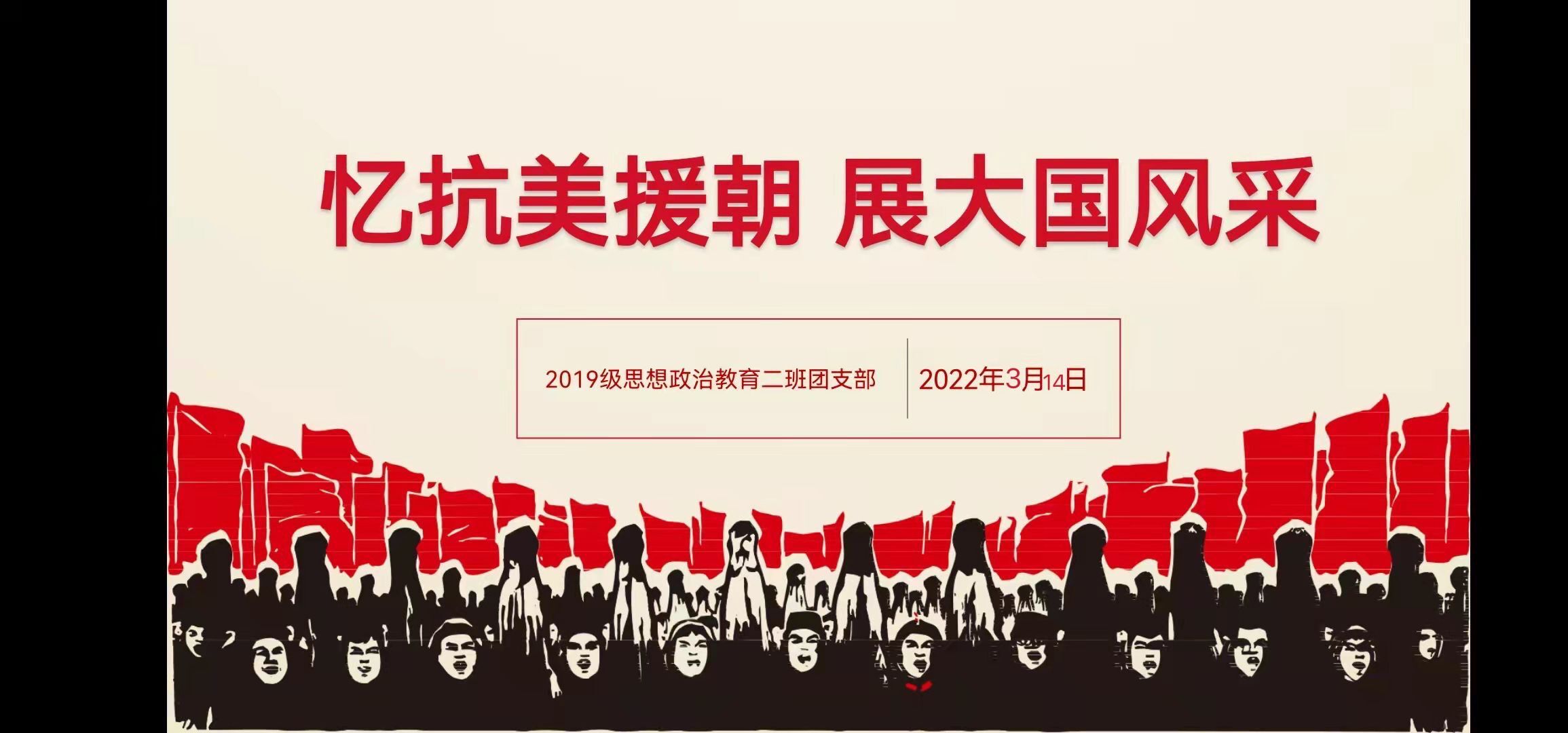 为缅怀革命先烈,弘扬民族精神,加强团员青年爱国主义教育,厚植爱国主义情怀,3月14日上午,beat365官网2019级思想政治教育二班在腾讯会议召开“忆抗美援朝,展大国风采”网上主题团课。2019级思想政治教育二班全体成员共同参会。会议由团支书孙雅娴主持。