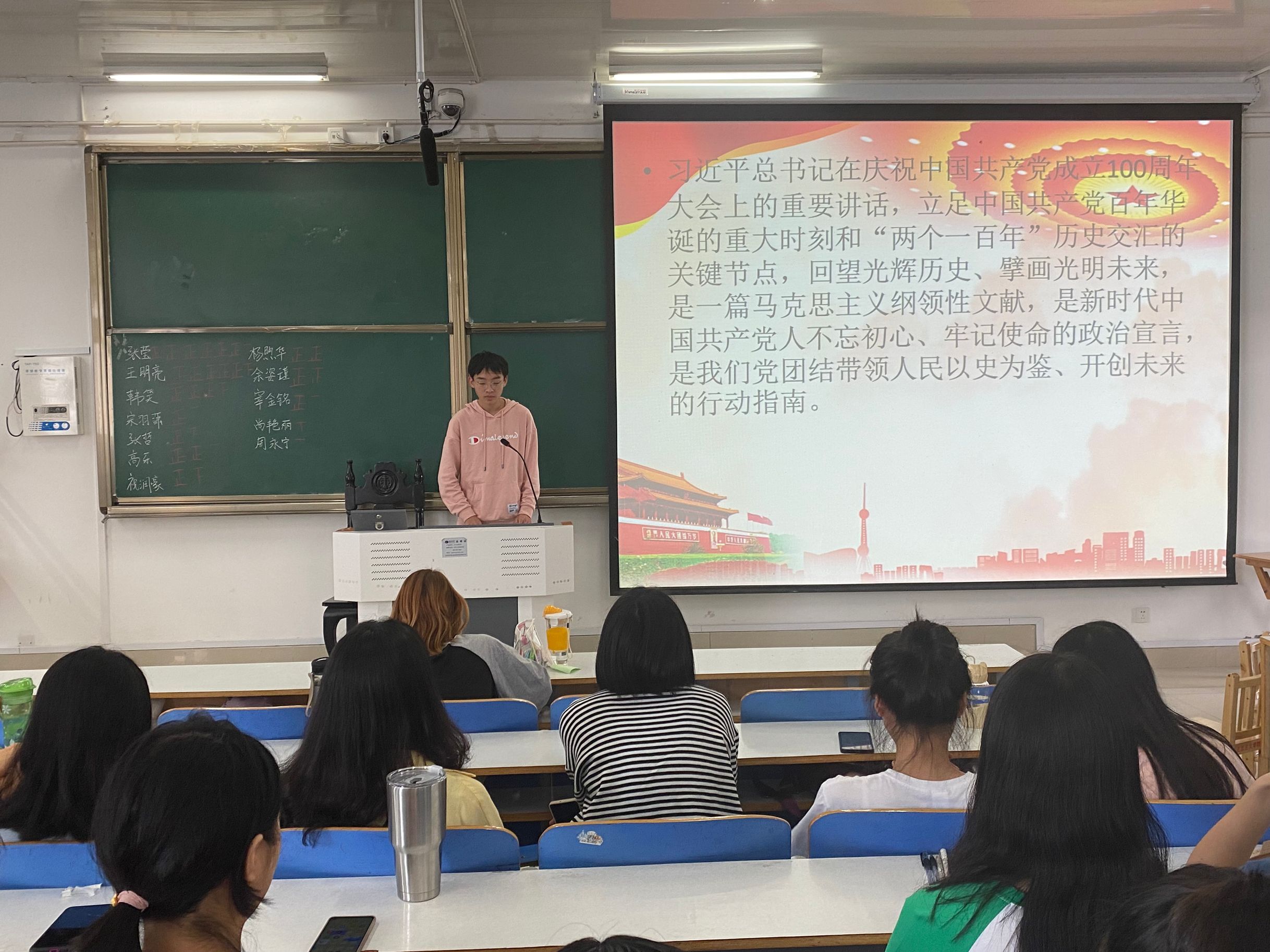 “请党放心,强国有我!” 8字铿锵有力的青春誓言响彻天安门广场。会议伊始,魏子豪通过播放庆祝中国共产党成立100周年大会视频片段,带领同学们重温大会激情澎湃的青春献词,再赴共庆百年华诞、赓续红色血脉的新时代征程。接着,魏子豪阐述了“七一”重要讲话精神的纲领内容,并突出强调“七一”重要讲话精神是目前党史学习教育的核心内容。他主要从伟大建党精神、“九个必须”根本要求等两个主要方面进行系统梳理。最后,魏子豪希望同学们深刻领会伟大建党精神的理论渊源、丰富内涵、内在逻辑和精神实质,奋楫扬帆,不负党恩。