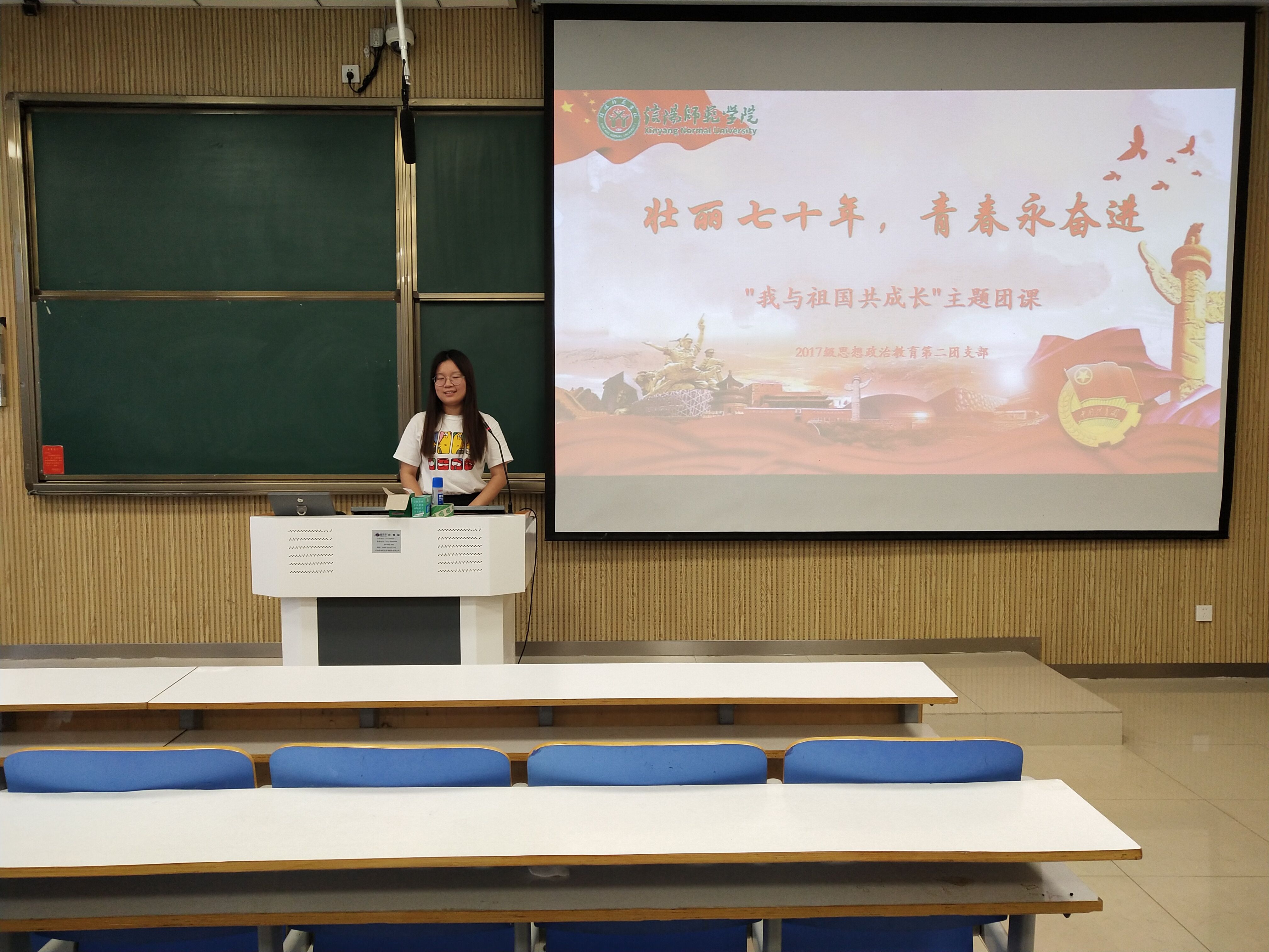 团课上,王泽鑫为大家介绍了本次活动的目的性和必要性,引导大家将个人奋斗融入到国家发展、时代进步的潮流中去。她通过播放幻灯片向同学们展示建国七十周年以来我国翻天覆地的变化,用影片和图象述说建党、建国、建团的艰辛历史,以及由古至今爱国人士不断为国家富强民族团结而奋斗的光荣事迹。观看幻灯片后,同学们相继发表了自己的观点,纷纷表示作为青年,要以奋斗诠释青春,要将个人梦融入到中国梦之中,尽自己所能为实现中国梦贡献更多的力量。
