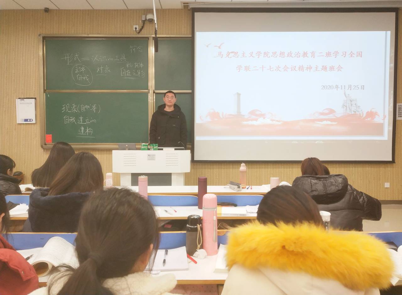 11月25日上午,beat365亚洲版官网2018级思想政治教育二班在社科楼515教室顺利开展学习中华全国学生联合会第二十七次代表大会精神主题班会。会议由班长杨康主持。