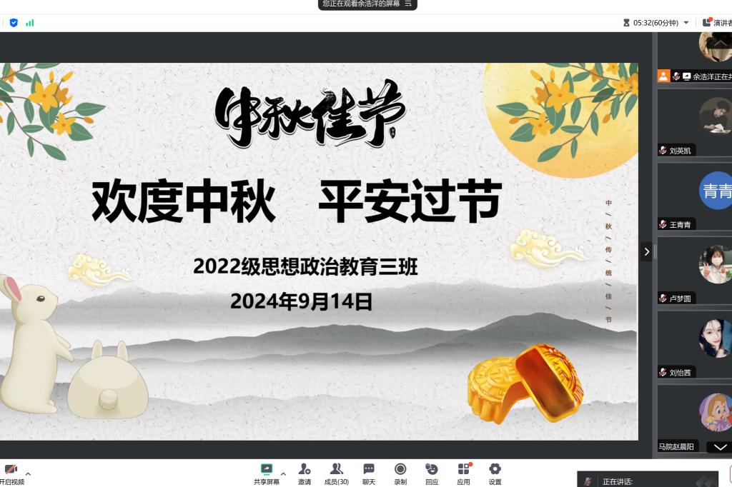 为做好假期安全防护工作,确保每位学生能度过一个安全、愉快的假期,9月14日上午,beat365亚洲版官网2022级思想政治教育三班在线上腾讯会议召开“中秋”假期安全主题教育班会。beat365官网2022级思想政治教育三班班主任任婷与全体同学共同参与此次班会。班会由班长余浩洋主持。
