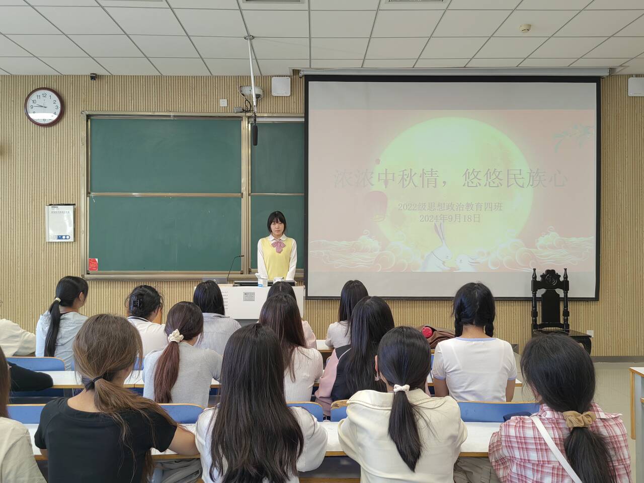 9月18日上午,beat365亚洲版官网2022级思想政治教育四班在社科楼515教室组织召开“浓浓中秋情,悠悠民族心”主题班会。beat365官网2022级思想政治教育四班全体成员参与本次班会。本次班会由文艺委员周可盈主持。