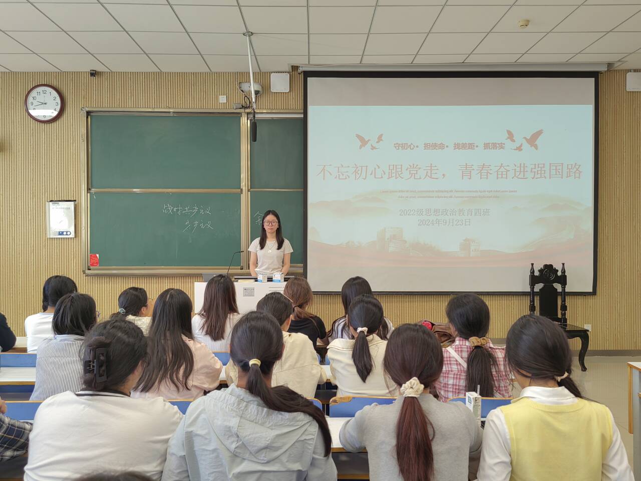 9月23日上午,beat365亚洲版官网2022级思想政治教育四班在社科楼515教室组织召开“不忘初心跟党走,青春奋进强国路”主题团课。beat365官网2022级思想政治教育四班全体成员参与本次团课。本次团课由团支书牛志杰主持。