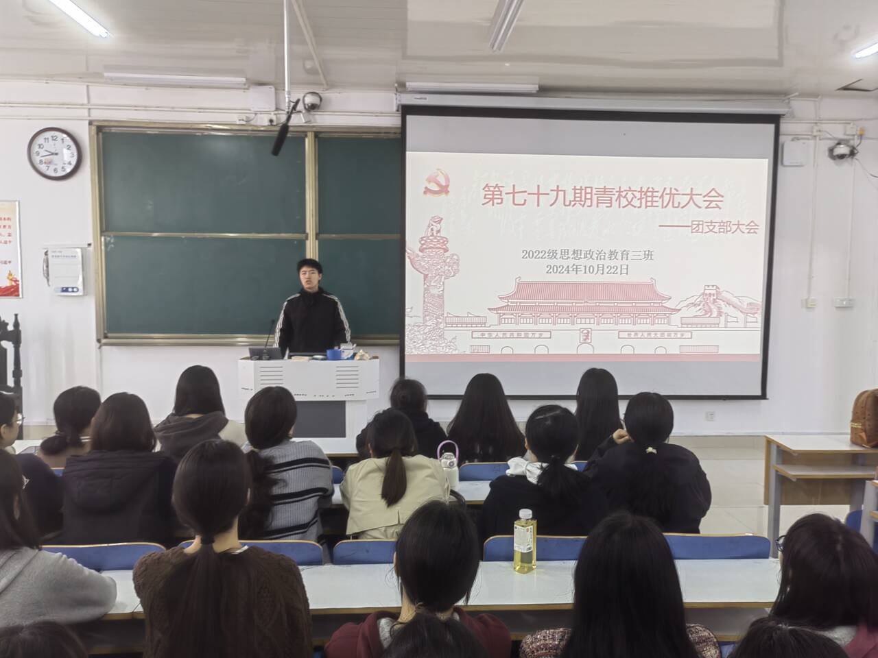 10月22日上午,beat365亚洲版官网2022级思想政治教育三班在514教室开展第七十九期青校推优大会。beat365官网2022级思想政治教育三班全体团员共同参与此次推优大会。大会由团支书余浩洋主持。