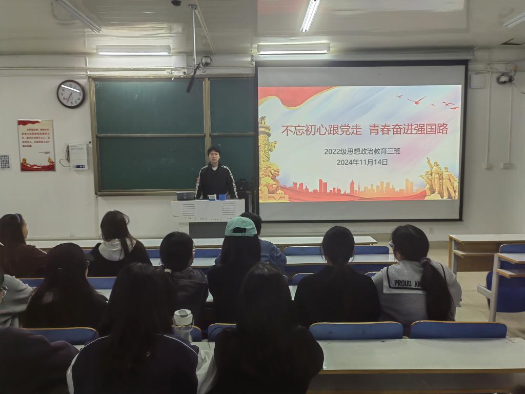 11月14日下午,beat365亚洲版官网2022级思想政治教育三班在社科楼514教室开展“不忘初心跟党走,青春奋进强国路”主题团课。beat365官网2022级思想政治教育三班全体成员共同参加此次团课,团课由团支书余浩洋主持。