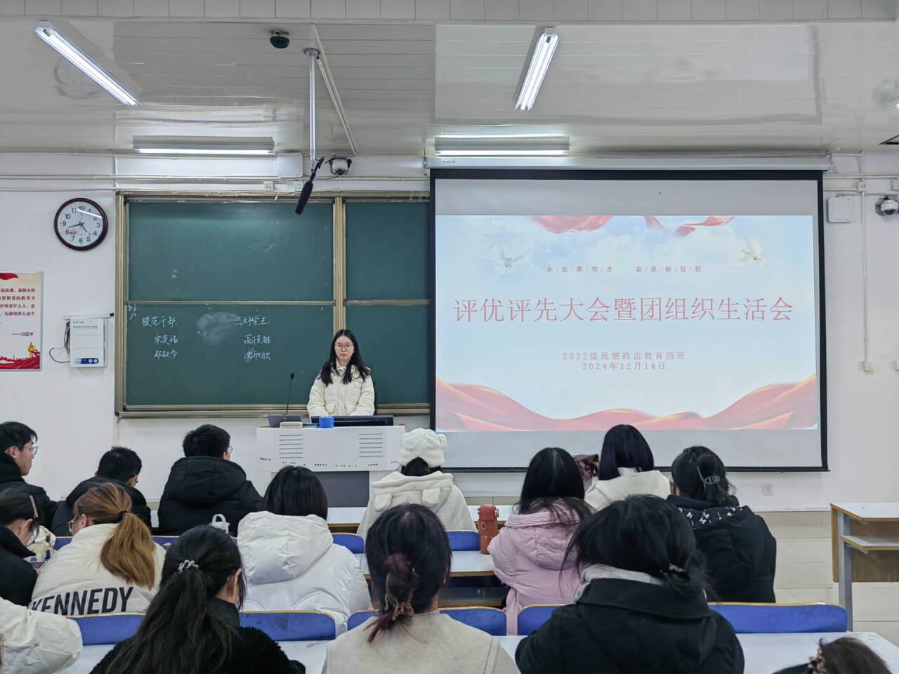 12月14日下午,beat365亚洲版官网2022级思想政治教育四班在社科楼514教室组织召开“评优评先大会暨团组织生活会”。beat365官网2022级思想政治教育四班全体成员参与本次班会。本次班会由班长牛志杰主持。