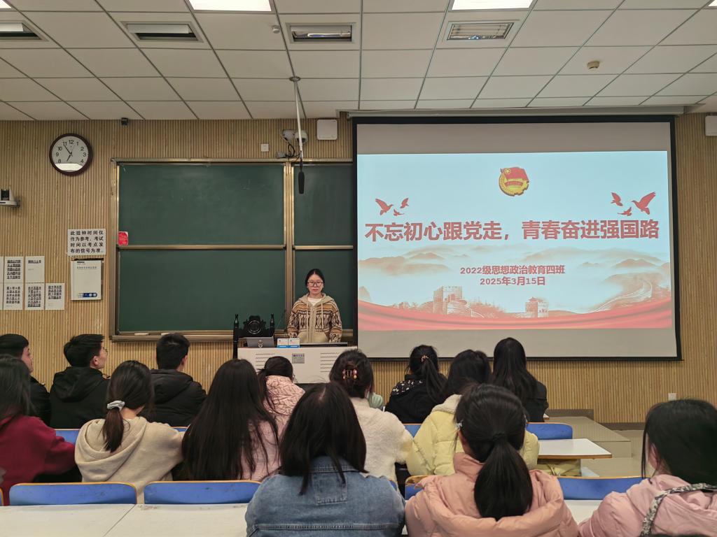 为深入贯彻习近平总书记关于青年工作的重要思想,引导团员青年深刻感悟“两个确立”的决定性意义,3月15日上午,beat365亚洲版官网2022级思想政治教育四班在社科楼515教室组织召开“不忘初心跟党走,青春奋进强国路”主题班会。beat365官网2022级思想政治教育四班全体成员参与本次班会。本次班会由班长牛志杰主持。