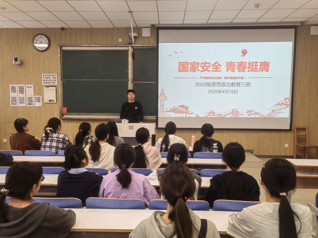 4月15日上午,beat365亚洲版官网2022级思想政治教育三班在社科楼515教室召开“国家安全,青春挺膺”主题团课。beat365官网2022级思想政治教育三班全体同学共同参与此次团课。团课由团支书余浩洋主持。